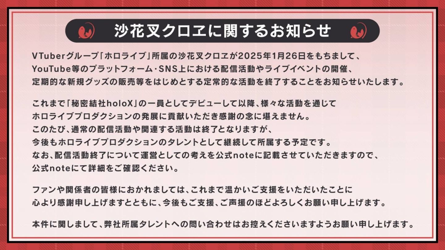 與此同時,hololive production 也發表沙花叉直播活動即將結束的公告,並宣布未來將新增「直播活動結束」的新形式,作為旗下 VTuber 離職(所謂「畢業」)的應對方式之一。