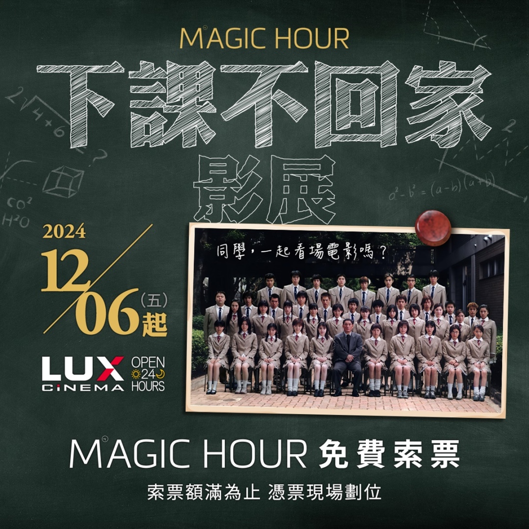 全台最大電影專屬社群APP「Magic Hour」舉辦「下課不回家」影展,祭出多部適合下課時間的觀賞的精采電影,12 月 6 日起《12.12:首爾之春》、《怒潮》、《搖滾吧!中二樂團》、《他的最後一個朋友》、《大逃殺》、《當殺手戀愛時》…等多部強檔電影輪番上陣,MAGIC HOUR會員可以免費上網選擇場次索票。