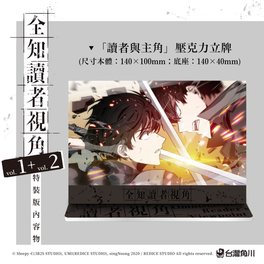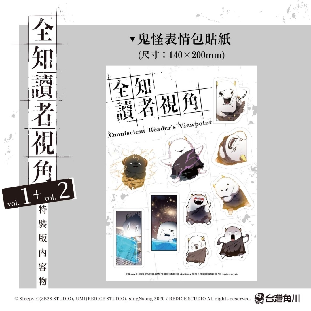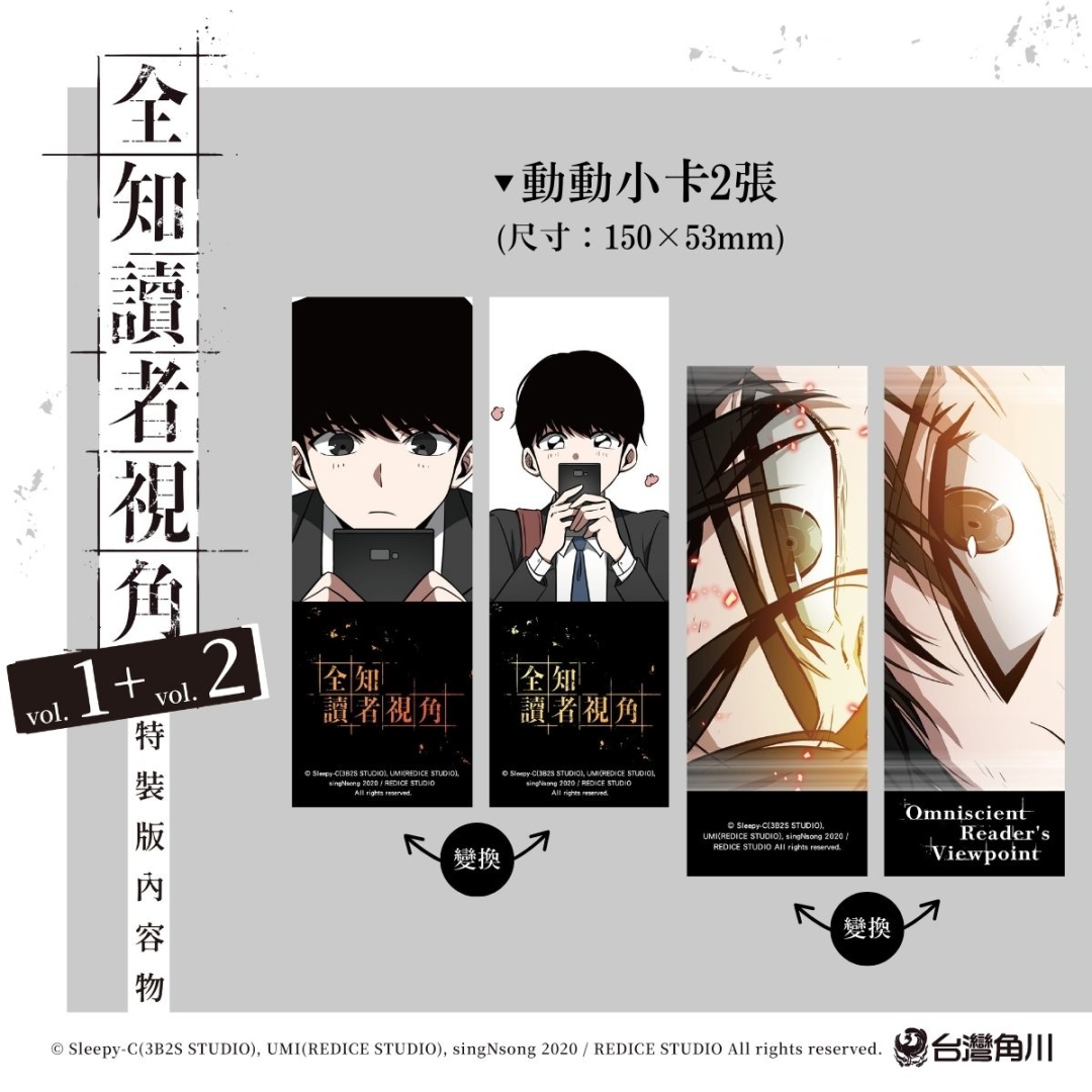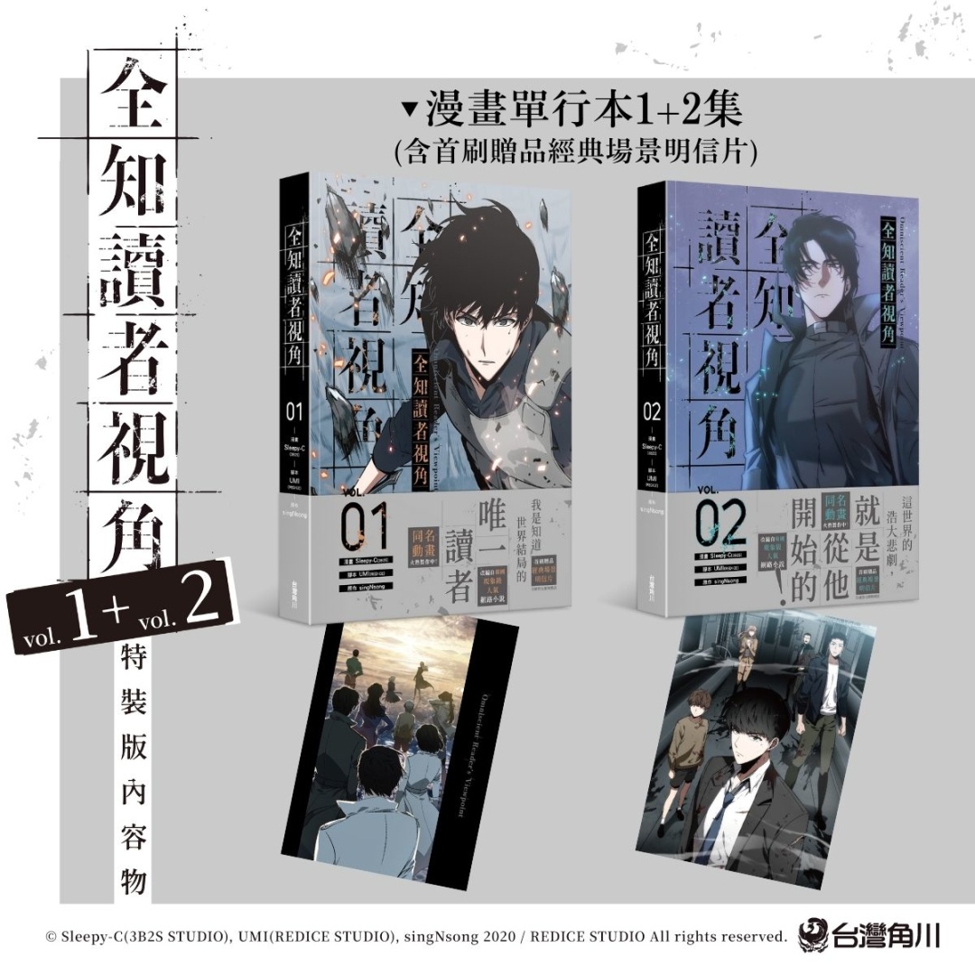我是知道世界結局的唯一讀者《全知讀者視角【1+2 特裝版】》限定版收錄特典:「讀者與主角壓克力立牌」、「動動小卡 2 張」、「鬼怪表情包貼紙」、「專員 金獨子 - MINOSOFT 識別證」,以及包含首刷贈品「經典場景明信片」的漫畫單行本《全知讀者視角1》與《全知讀者視角2》,以上內容皆收錄於特裝版「珍藏書盒」中。