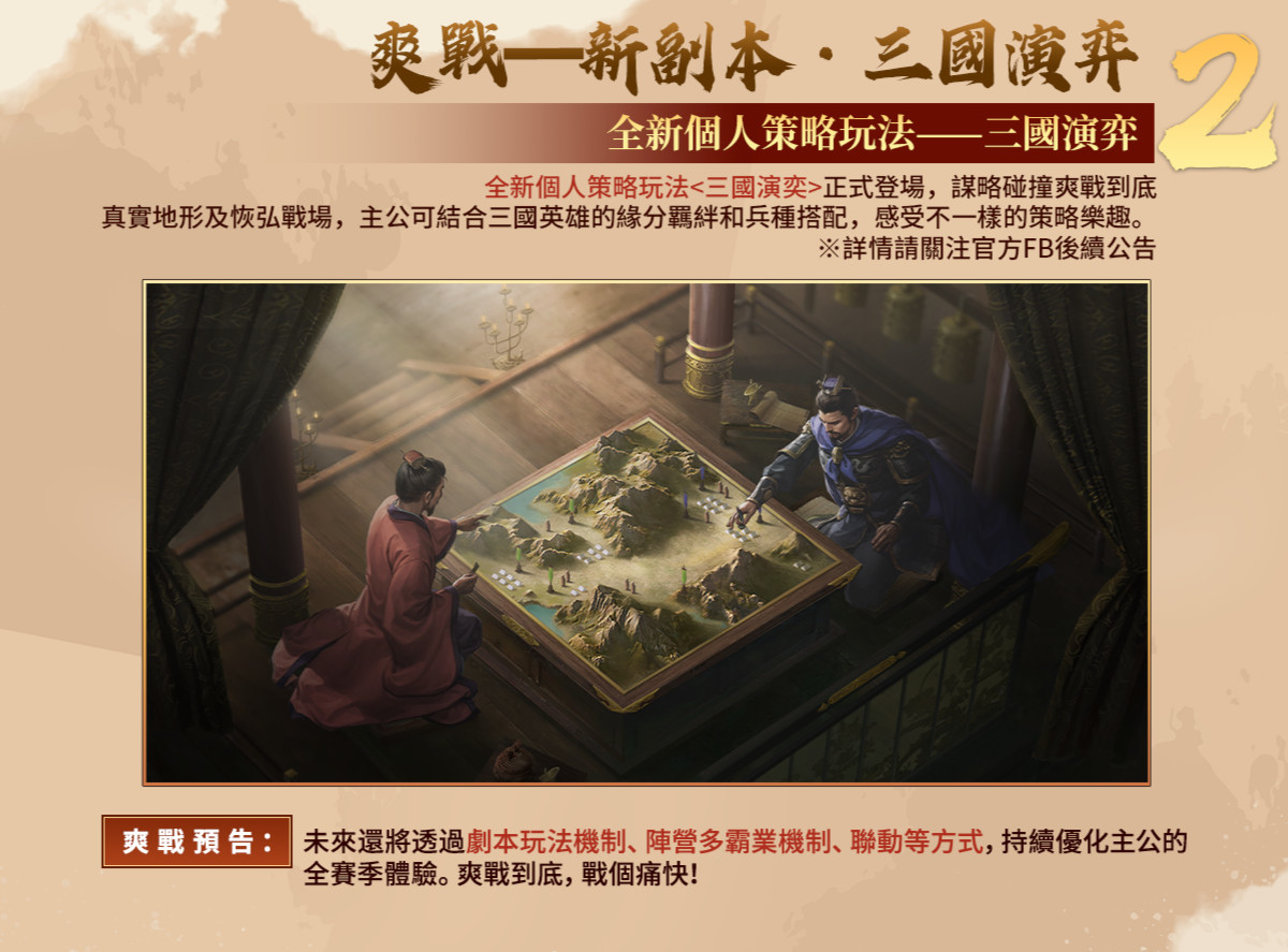 .「爽戰」方面,官方未來將全新推出「三國演弈」玩法,為戰場帶來更多樂趣,讓賽季末不再長草;