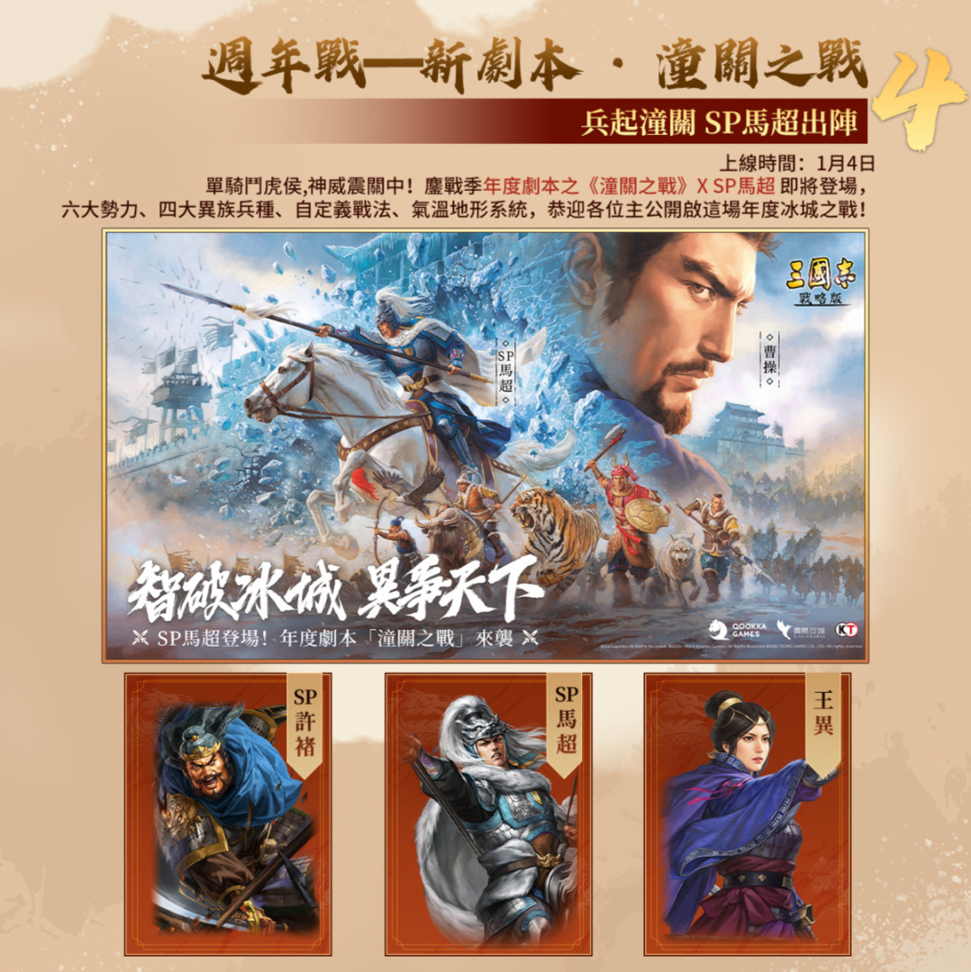 .「週年戰」方面,重磅年度劇本「潼關之戰」即將上線,新 SP 武將馬超隆重登場!