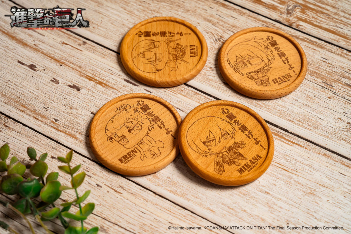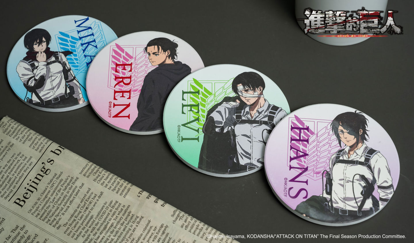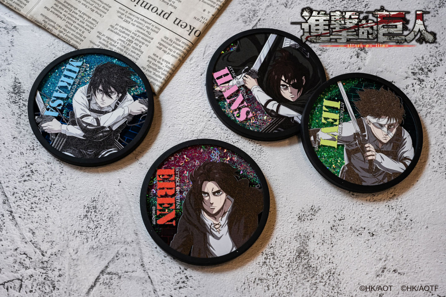 「木杯墊」四位角色Q版造型配上日文版的獻出心臟吧文字,總之買下去就對了!喝水就要搭配「流沙杯墊」艾蓮、里維、米卡莎及漢吉有各自代表色,流沙滑下來瞬間帥又療癒!冬天用馬克杯喝熱飲必搭配「陶瓷杯墊」,圍紅圍巾的米卡莎沒有理由不買啊!