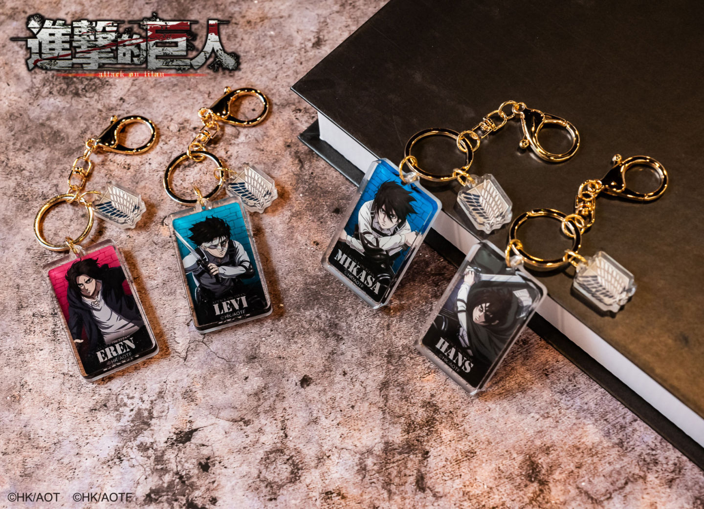 「流沙壓克力鑰匙圈」四位角色帥氣的模樣搭配自由之翼圖樣,一定要把喜歡的角色掛在包包上唷!一年四季都要穿,「T-shirt」有黑色艾連款、灰藍色里維款、綠色阿爾敏款還有黑色的超大型巨人及里維款,穿在身上展現對巨人的熱情!