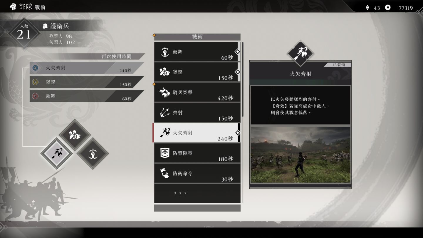 本作戰場另一個特色是「護衛兵」,這也能幫助玩家攻擊武將,途中也有不少任務要讓玩家完成才能增加護衛兵的數量解放更多戰術,然而問題在於高難度在場中,護衛兵還是有機會死亡的,一旦死亡補充兵力的機制不明,會造成無法發動戰法、無法破壞敵方兵器、大門等問題還是有點困擾,因此不太能作到帶著護衛兵團單騎殺入敵陣的戰法,比較偏向順風士氣下的戰術操作。