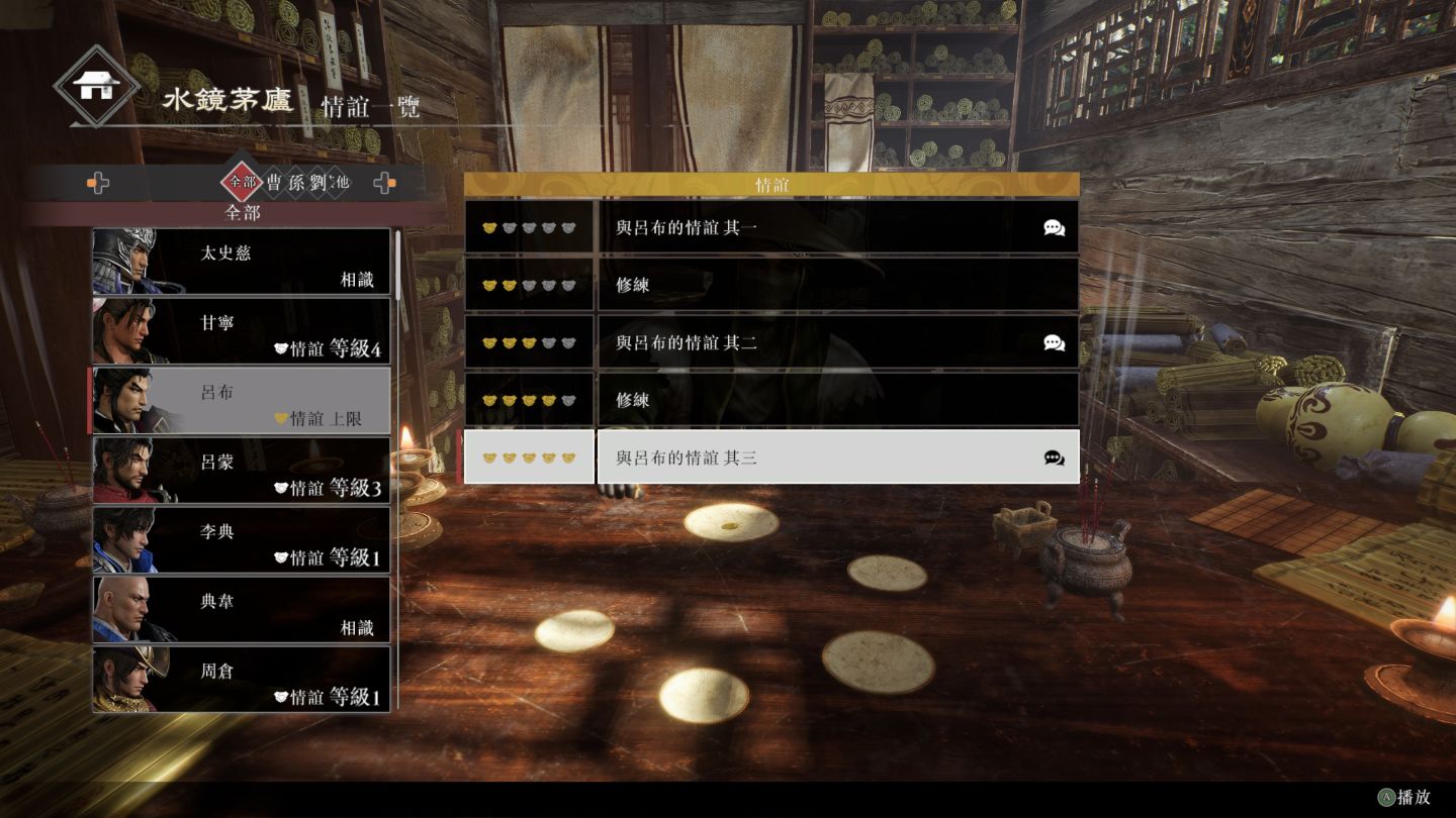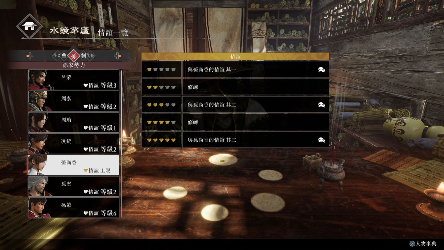 完成武將的「修練」或「委託」任務可以提升與該武將的情誼值,而情誼值提升後,玩家不僅可以解鎖更多的劇情事件,還能獲得額外的古錢作為報酬,甚至學習特殊的武藝。武將交流的觸發條件並不局限於單一場景。玩家可以在「水鏡庵」中獲取情報,得知當前可以互動的武將所在位置。讓玩家能更主動地規劃與武將的互動,而不是單純等待觸發劇情。