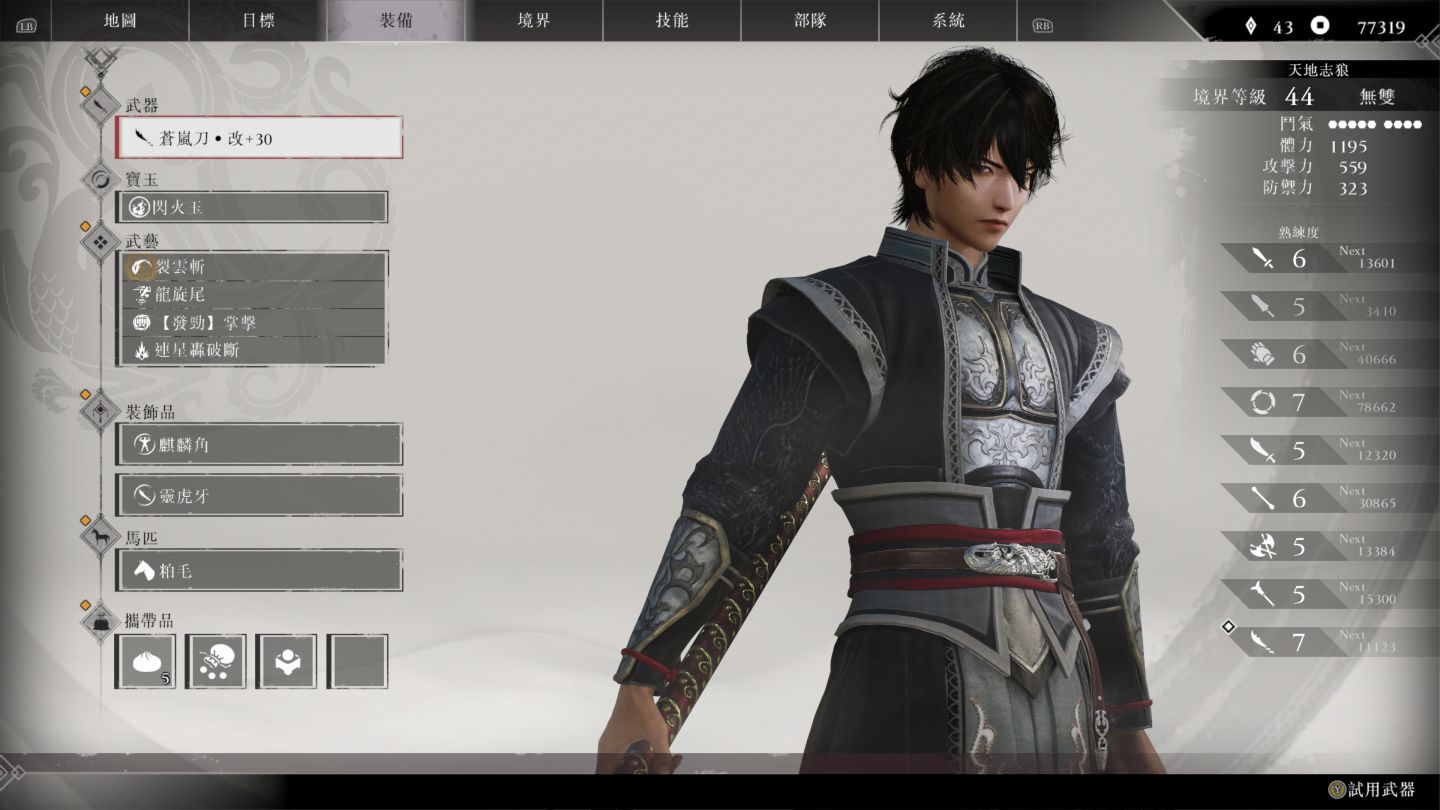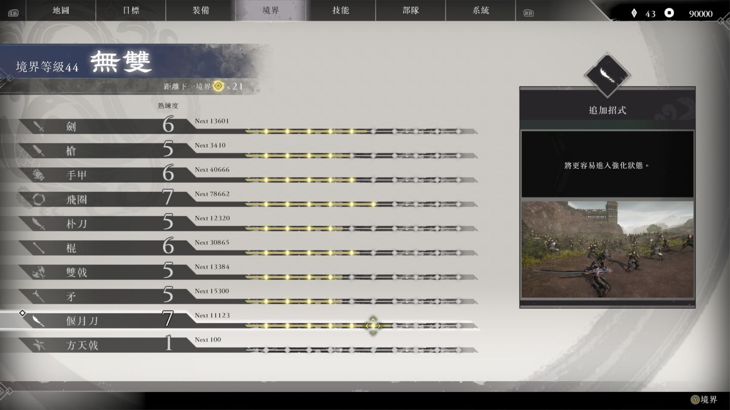 角色的技能與武器系統都重新設計過,截至破關之後共有十把武器能夠使用,基本上對應無雙武將的種類而定,加上「境界」的技能培養分支設計,玩家的原創武將可以從無名小卒培養成無雙武神,還能周遊中國地圖各地,獲取不同武藝技能。