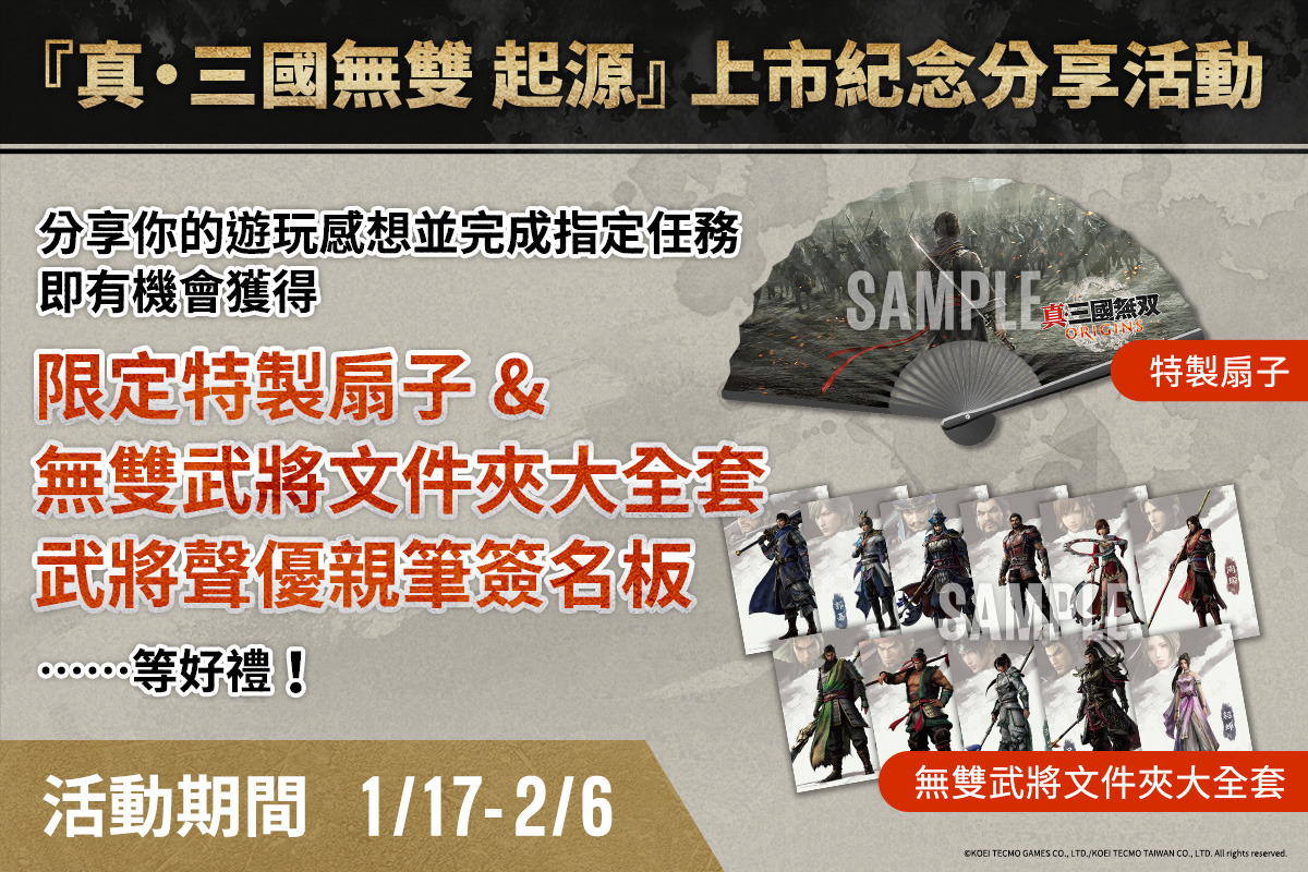 臺灣光榮特庫摩 Facebook 現正舉辦「上市紀念分享活動」,玩家於指定貼文中分享遊玩感想並完成指定任務,將有機會一口氣獲得曾於「東京電玩展」中以隨機方式贈送的精美限量「武將資料夾」大全套與以主視覺所設計的「限定特製扇子」,或參與本作品演出的聲優(日文配音)親筆簽名板等豪華好禮。