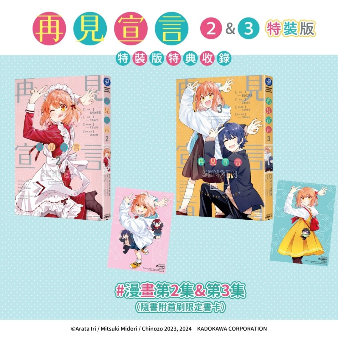 台灣角川今日宣布,《再見宣言》漫畫單行本第 2、3 集將於 2025 台中國際動漫節正式推出,並同步發售收錄獨家特典的完結篇特裝版,即日起限期開放預購,喜愛《再見宣言》的讀者務必把握機會。