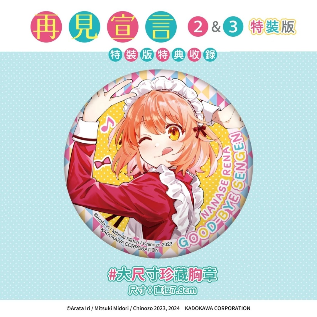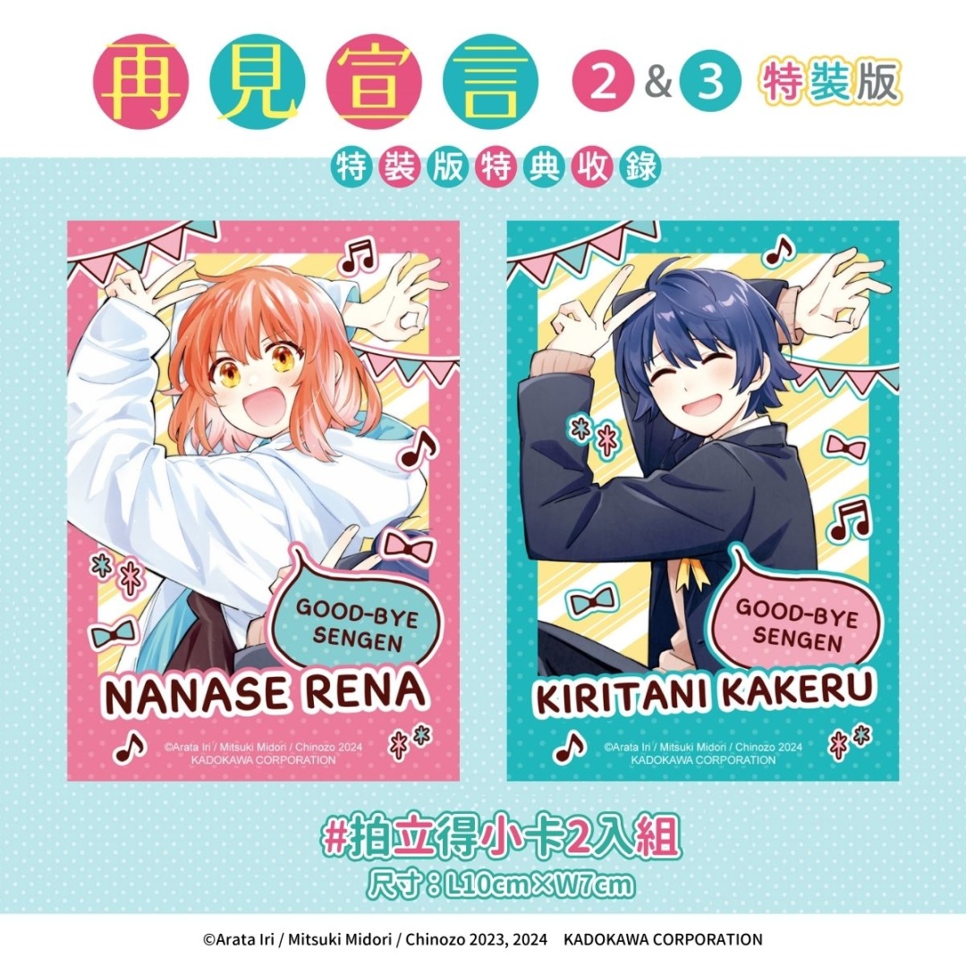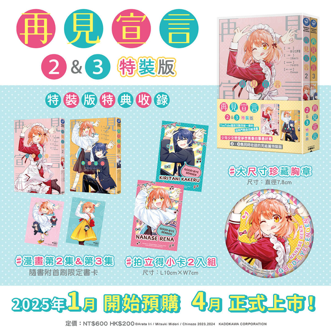 不擅交流的半繭居族少年×閃閃發亮的活潑美少女,青春故事最終章《再見宣言 (2)、(3) 特裝版》收錄:可愛又充滿收藏價值的「拍立得小卡 2 入組」、女僕裝扮的玲奈「大尺寸珍藏胸章」以及「漫畫第 2 集&第 3 集(隨書附首刷限定書卡)」全數收錄於「PP 透明書盒」。特裝版自即日起開放事前限期預購至 2/3(一)23:59止,於台灣角川官網完成預購再加碼贈送購物金 100 元。