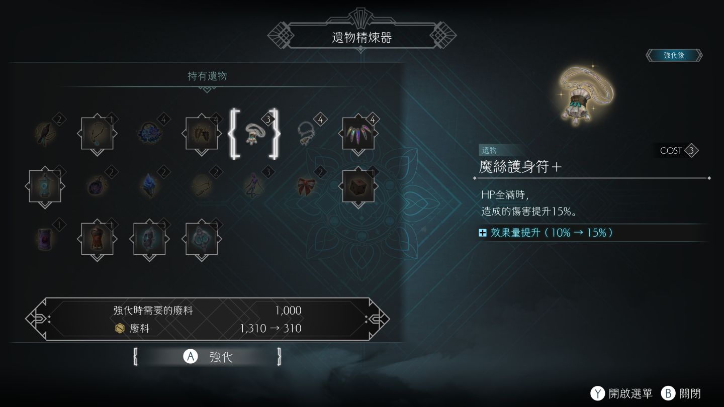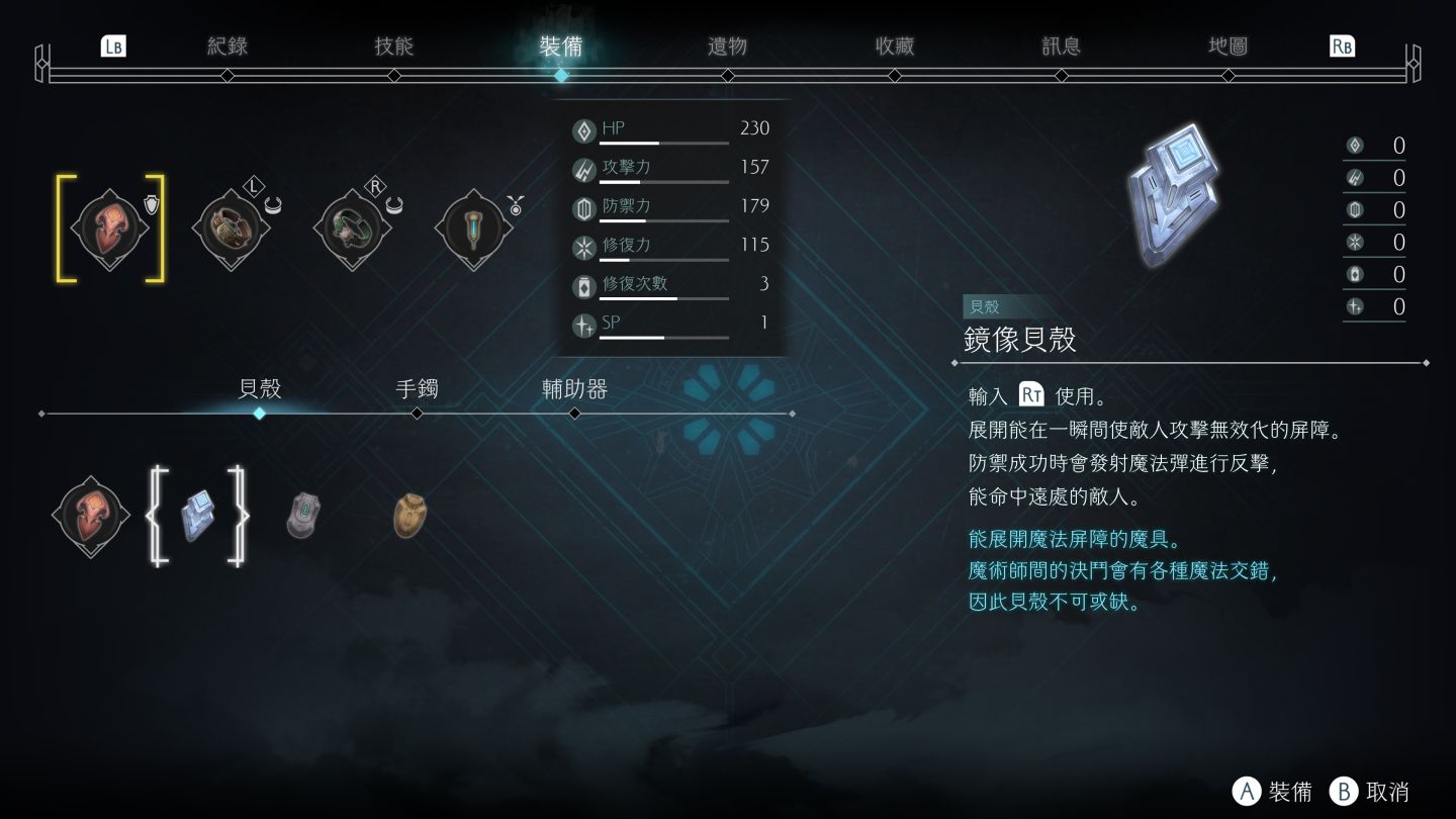 在裝備系統上繼承前作的遺物外還新增了貝殼、手鐲和輔助器等裝備。遺物可以從上述提到的「廢料」進行強化,在有限的成本限制下,裝置有利於探索戰鬥的裝備,在既有的「閃躲」更多了以「防禦」為手段的貝殼裝備,萊菈可增加可以防禦敵人攻擊的動作,防禦成功時依照貝殼的不同會觸發各種不同的反擊方式,至於「輔助器」則有瀕死回血、自動補血等比較特殊的功能。