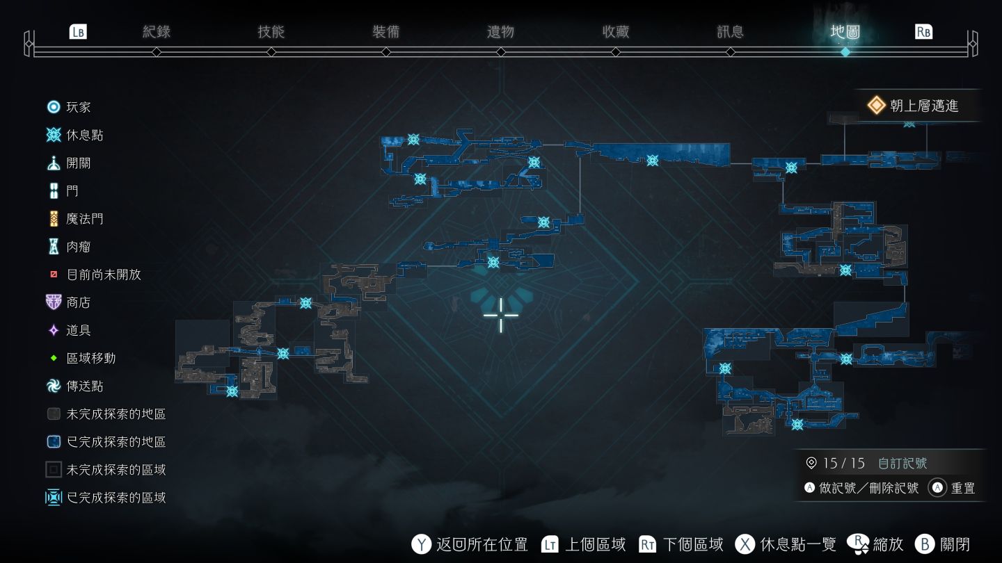 但是更重要的在於取消格狀標示,改為依照地形描繪,玩家可以在地圖上看到自己準確的位置。此外休息點、發現的未取得道具、阻擋的障礙物都會在地圖中標示出來。障礙物甚至還另外區分目前進度無法清除的障礙物和取得特定道具後可以清除的障礙物。此外也提供了 15 個自訂記號讓玩家隨意標記。因此就算不看任何攻略,玩家也能僅靠遊戲提示說明找完所有的道具