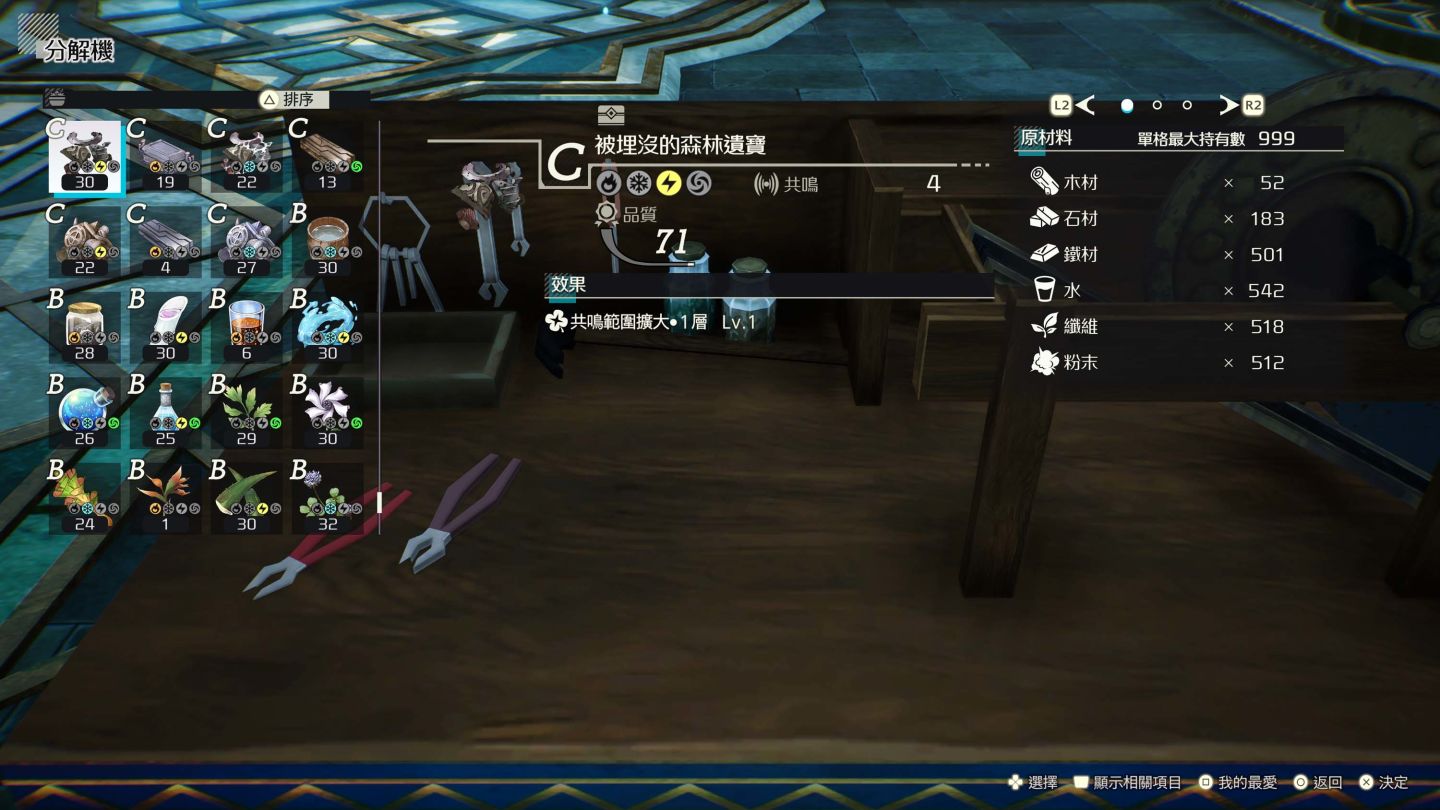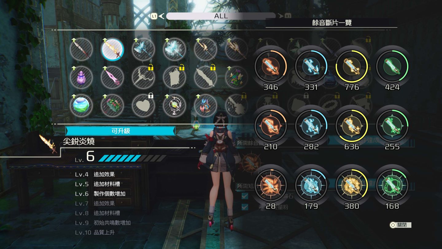 原野上的寶箱等之中可以獲得「特性結晶」,將特性結晶裝在道具或裝備上,可以提升道具的性能。而原野各處的「瑪那間歇泉」中,可以取得「餘音斷片」,蒐集必要的素材之後,就可以回想起新的配方。仔細探索原野上各個角落,強化配方以做出更強大的道具吧!