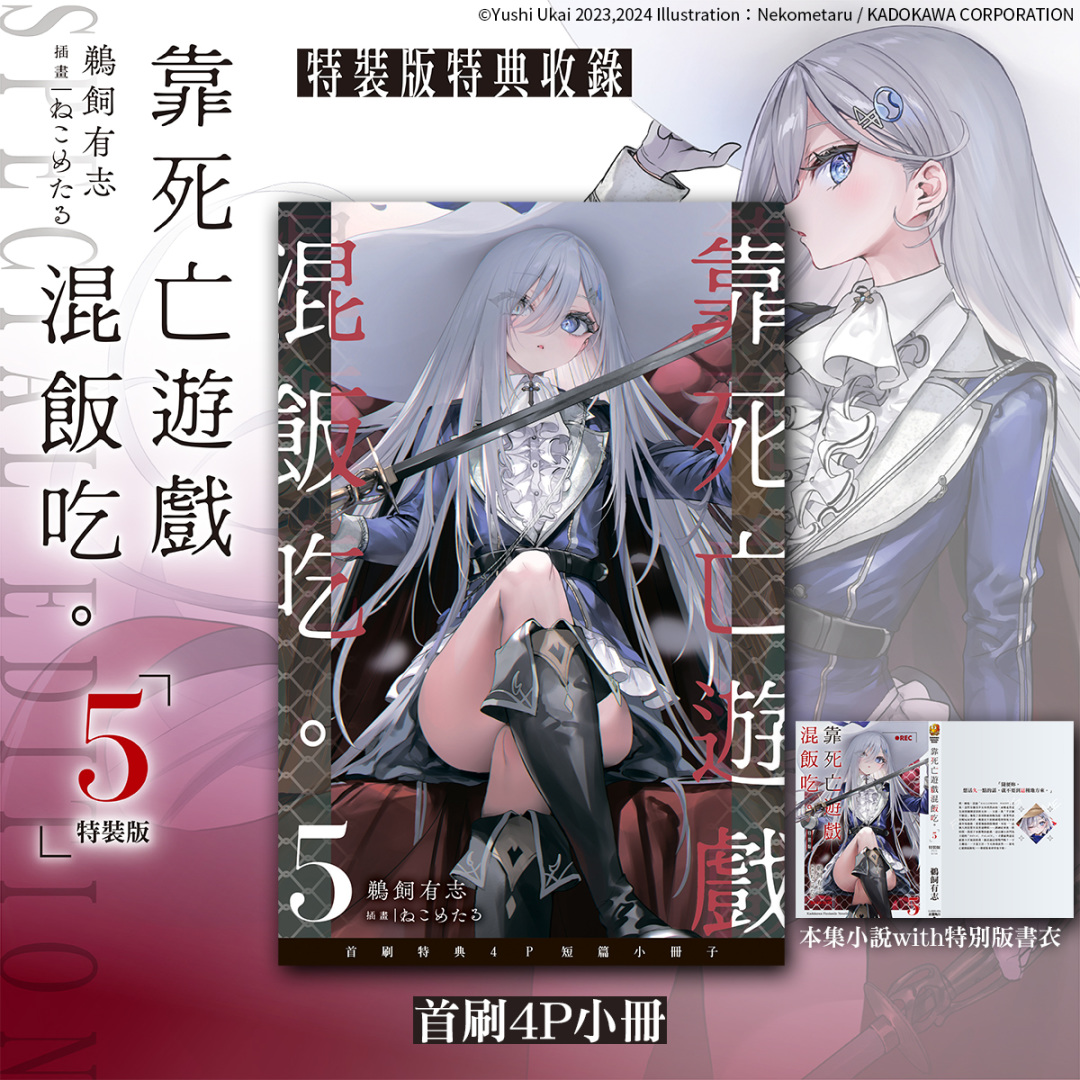 輕小說家「鵜飼有志」著作、繪師「ねこめたる」合力創作的超人氣生存主題遊戲題材的輕小說《靠死亡遊戲混飯吃。》,以驚險刺激的劇情與角色魅力引發話題,作品也已宣布電視動畫化決定!本次也將在台中國際動漫節發售全新續篇第 5 集,並同步推出收錄書籍與多款限定週邊的特裝版,也自即日起開放限期事前預購。