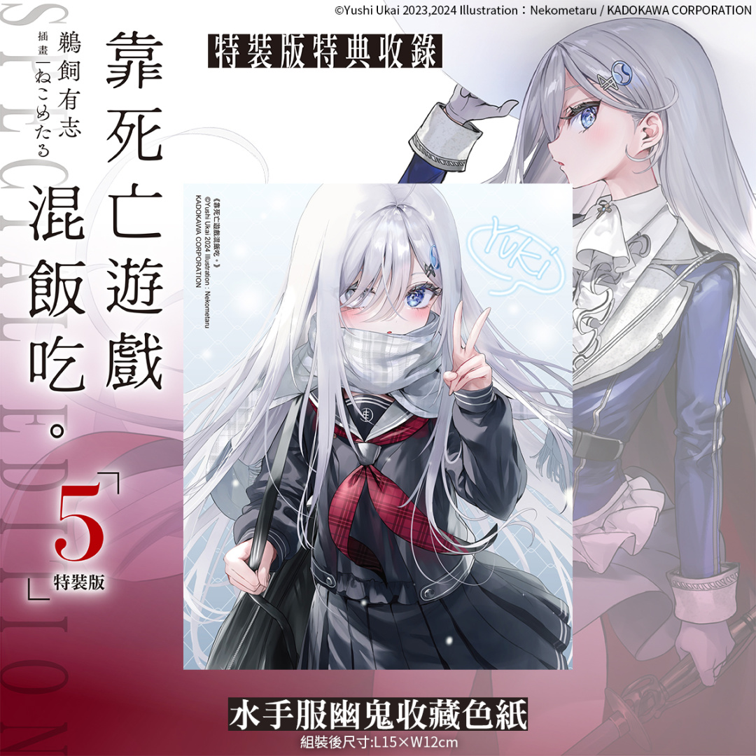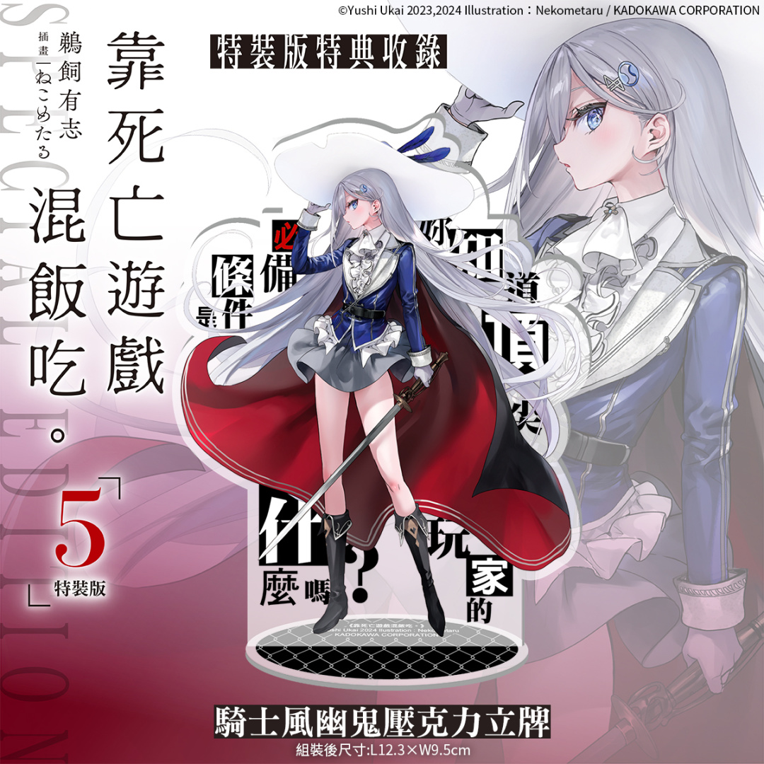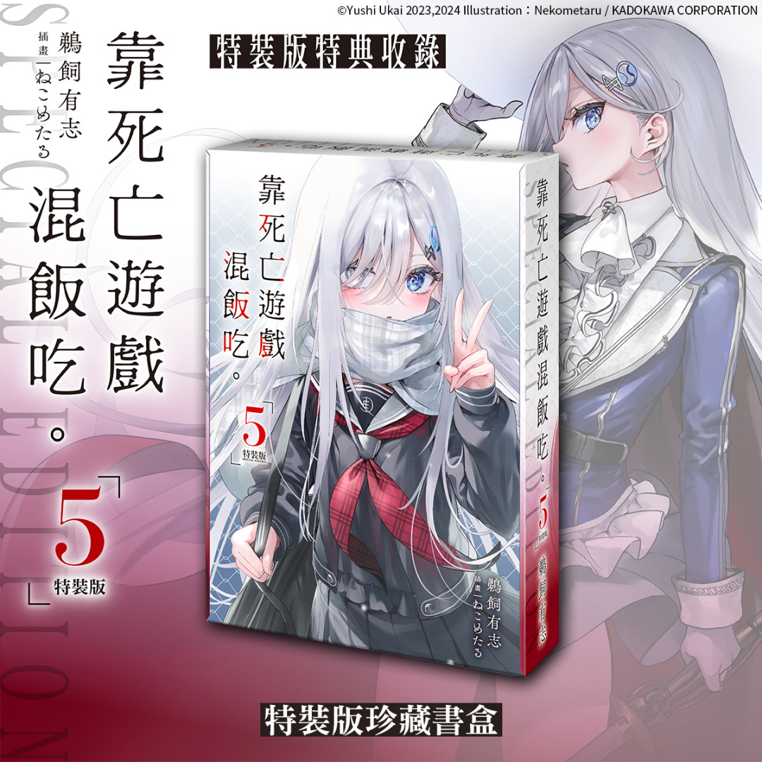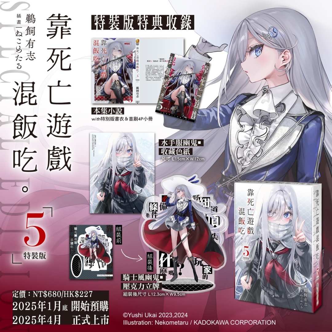 《靠死亡遊戲混飯吃。(5)》特裝版以 JK 遊戲玩家幽鬼在劍士決鬥為主題的「ROYAL PALACE」做設計,隨書附贈「本集小說 with 特別版書衣」&「首刷 4P 短篇小冊子」、冬日打扮的「水手服幽鬼收藏色紙」以及展現她颯爽英姿的「騎士風幽鬼壓克力立牌」,皆收錄於「特裝版珍藏書盒」,讓粉絲能完整收藏幽鬼的各種魅力主題造型。