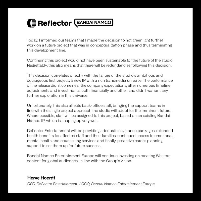 隨著《無名九使 覺醒》續作中止開發,部分人員將會被分配到現有的萬代南夢宮項目,但也有員工將遭到裁員,儘管公司承諾未被裁員的員工提供後續支援與協助,但裁員規模尚未公開。順帶一提在去年 11 月 Reflector Entertainment 已進行裁員,裁減了全體員工的約 18%人,而這次中止《無名九使》系列開發再次帶來裁員計畫;同時萬代南夢宮現有 IP 相關專案則被描述為進展順利,工作室及其專案未來的動向將繼續受到關注。