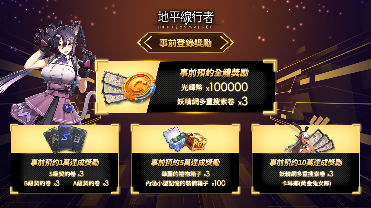 即日起完成預註冊的玩家,隨著預註冊人數解鎖更多豐富獎勳。最高可獲得高級契約卷、華麗的禮物箱子、卡琳娜(黃金兔女郎)等珍稀獎勵!此外,所有完成預註冊的玩家,在開服時將獲得 10 萬光輝幣和 3 張妖精網多重搜索卷!