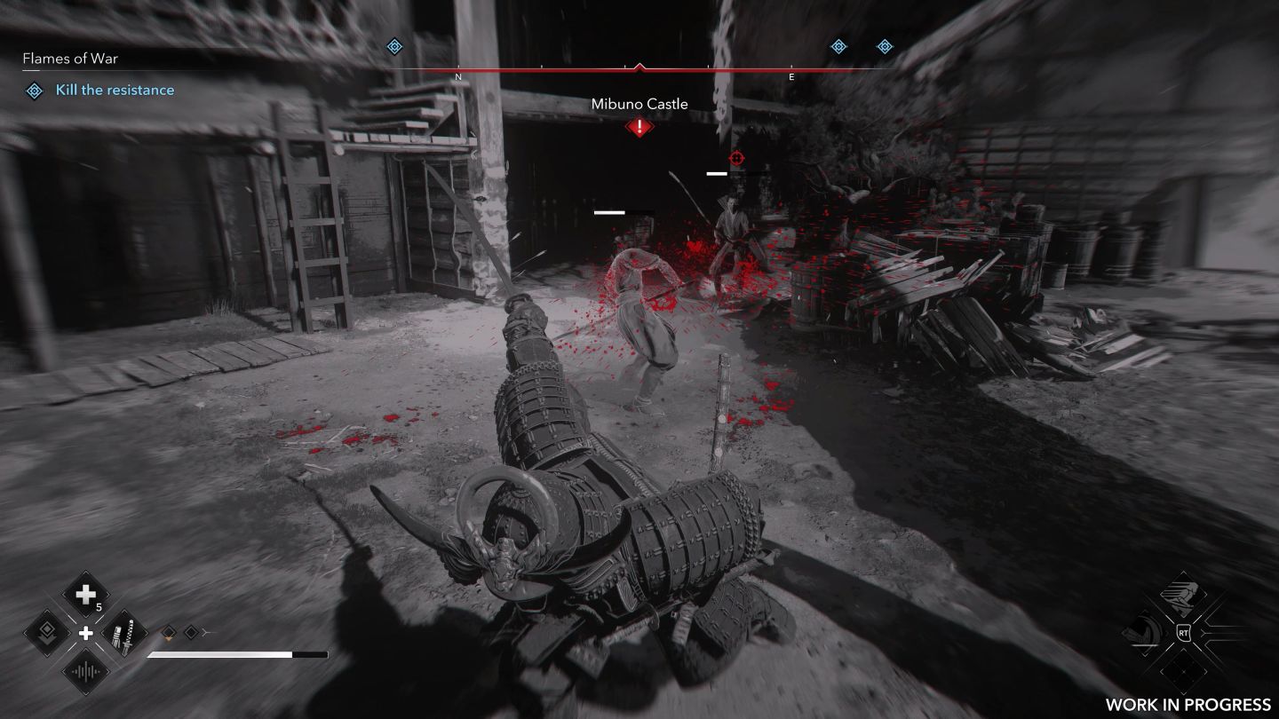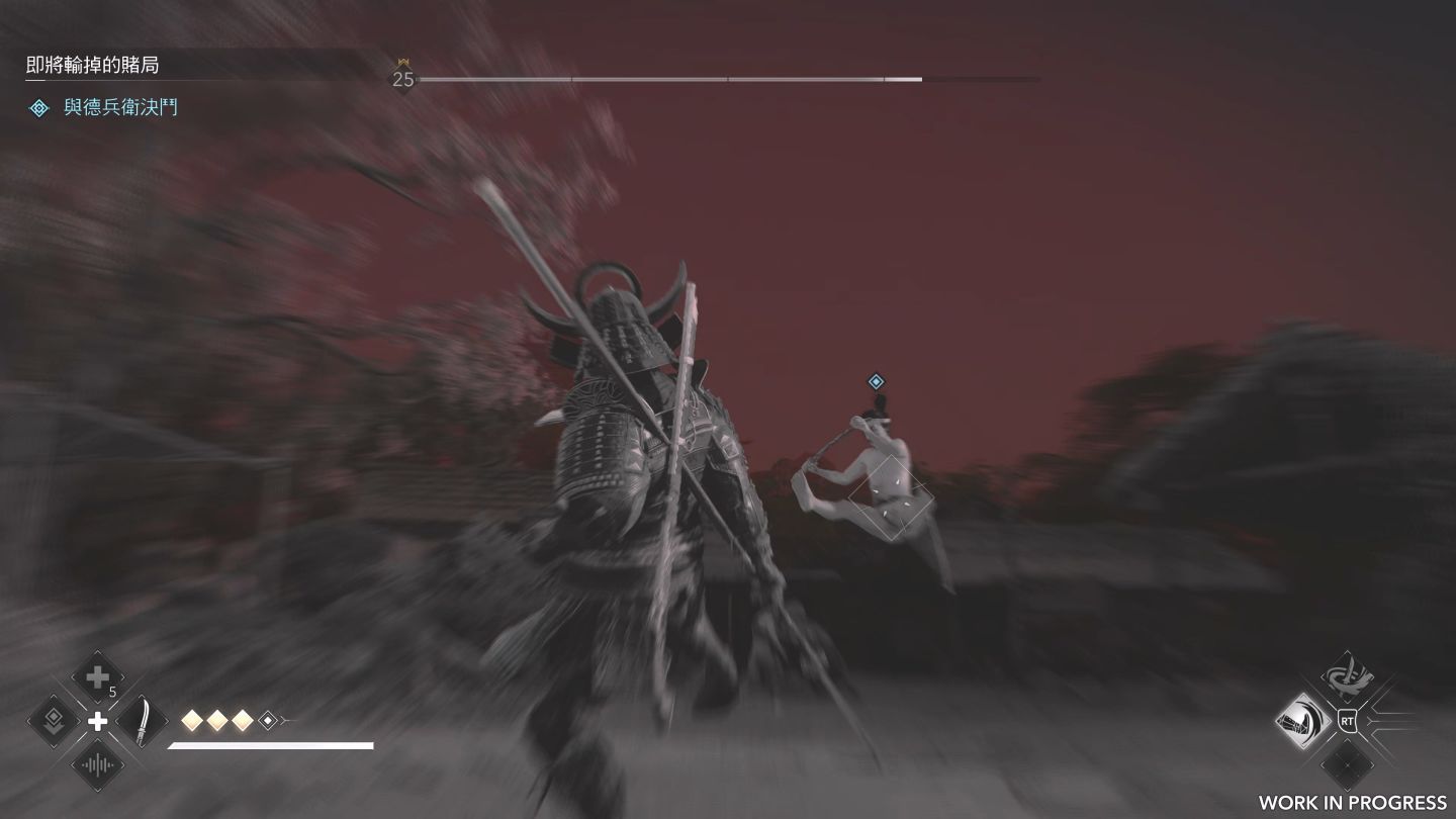 在彌助的路線中,玩家可以根據自己的喜好選擇武器和戰鬥風格,進行近身格鬥或遠程攻擊。遊戲也保留了系列經典的招架和反擊機制 ,考驗玩家的反應速度和戰鬥技巧。戰鬥中玩家需要注意敵人的「架勢條」完美格擋可以削減敵人的架勢條,而架勢條歸零的敵人將會陷入昏厥狀態,更容易被擊殺。