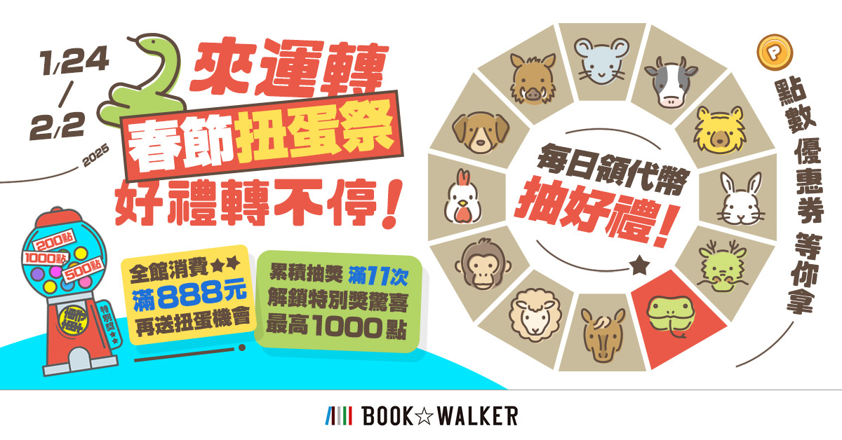 和動漫節一起熱鬧登場的還有 BOOK☆WALKER 蛇來運轉春節扭蛋祭活動!1 月 24 日至 2 月 2 日每日於活動頁簽到,或全館消費滿 888 元就能獲得 1 枚銀幣(可累計),使用銀幣參加一般獎扭蛋,就能隨機獲得點數、優惠券等好禮。抽獎累計滿 11 次,即可解鎖特別獎驚喜,最高獲得 1,000 元購書金(點數 1 點折抵 1 元,無使用門檻)。春節期間記得天天打開活動頁簽到,試試手氣,豐富好禮轉不停!