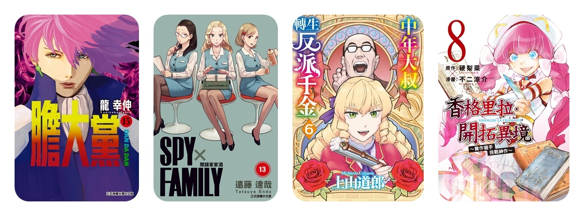 還沒鎖定假期讀物的你,不妨試試年度人氣作品《膽大黨》、《SPY×FAMILY 間諜家家酒》與劇情搞笑又充實的熱播冬季動畫原作《中年大叔轉生反派千金》、《香格里拉・開拓異境~糞作獵手挑戰神作~》,一起度過愉快時光!