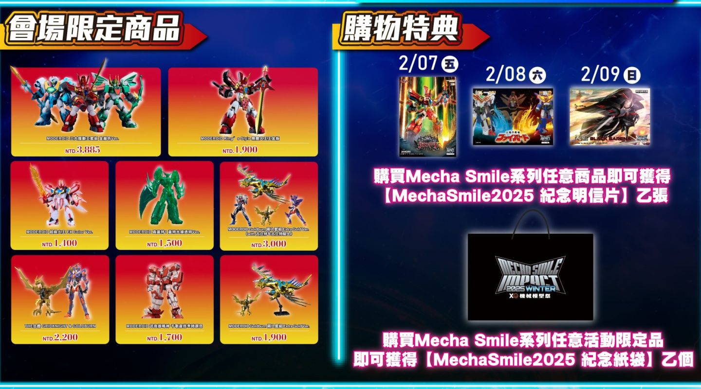 Mecha Smile Impact機械模型祭(#GSC機械模型祭2025)本次也有帶來全新活動限定商品,海外最快發售《真蓋特機器人 世界最後之日》「MODEROID 真蓋特1 蓋特光線透明色Ver.」及《魔動王》「MODEROID 超級火王 EX Color Ver.」!還有會場購物特典:紀念明信片及紀念紙袋,明信片設計活動三天皆不同款式!