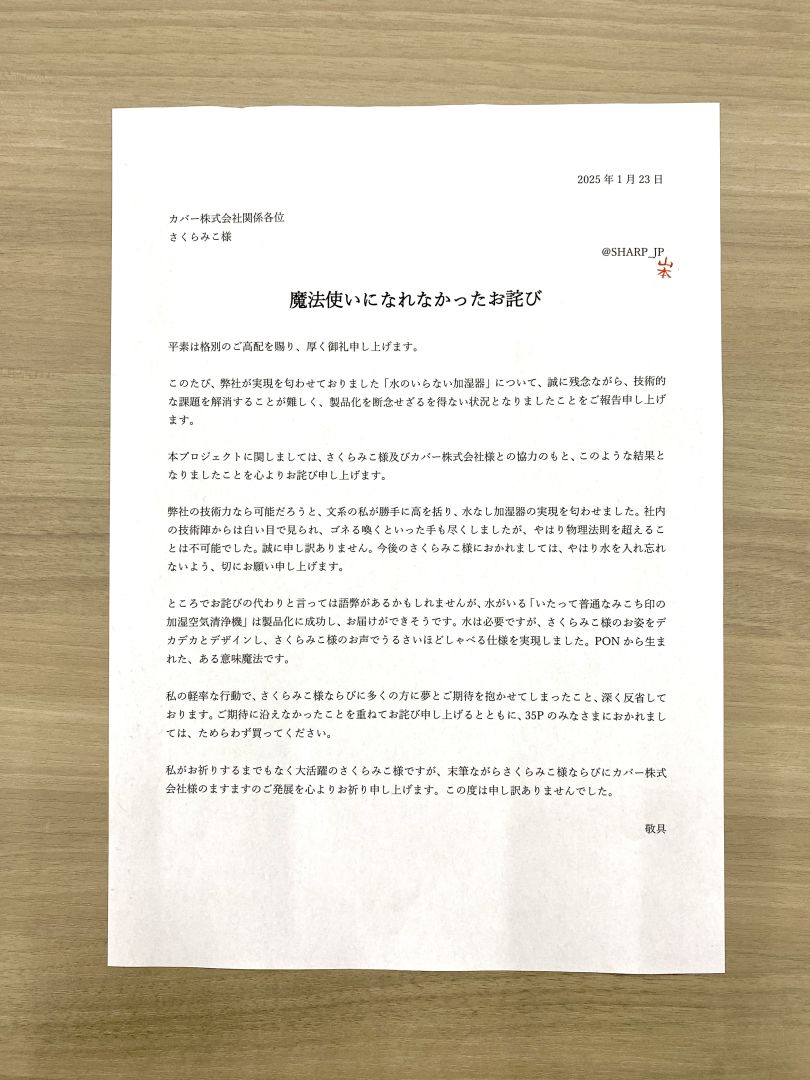 但在今天,SHARP 的員工非常正式的前往 Cover 向社長谷鄉元昭(Yagoo)致歉,表示所謂的「不用加水的加濕器」因技術上的難題未能克服,導致產品開發未能順利完成,不得不中止上市企劃,取而代之的是成功開發一款印有櫻巫女圖像和加入語音的加濕器,因為櫻巫女 PON 的表現所誕生的這項產品,某種意義上來說的確是魔法,並對因輕率的舉動導致櫻巫女和其他粉絲的夢想與期望落空深表歉意。