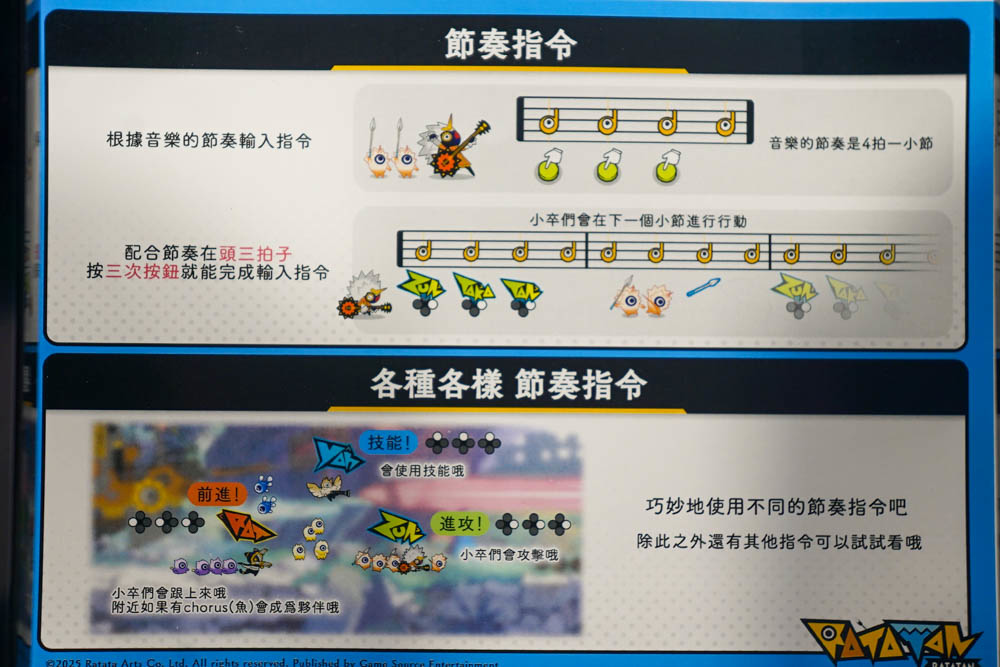 但不同於《戰鼓啪打碰》,拉塔坦可以自由移動中指揮小兵整列,透過移動拉塔坦的位置來保護小兵。拉塔坦本身也可以加入攻擊行列。結合在《RATATAN》中節奏的指令目前有三種,前進、技能與攻擊,未來還有可能增加其他的指令,但並非是增加操作難度,而是讓遊行的音樂更加豐富。
