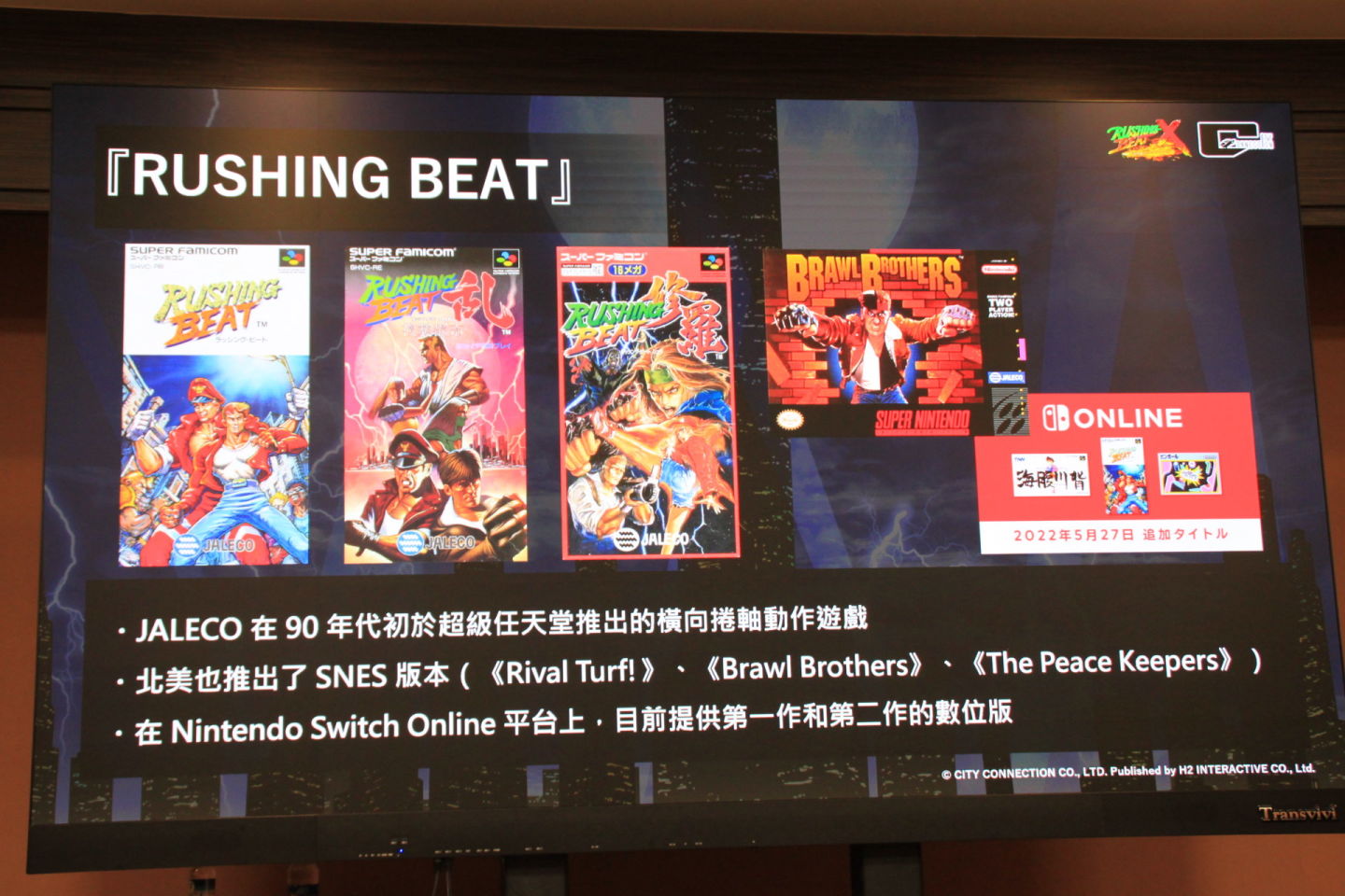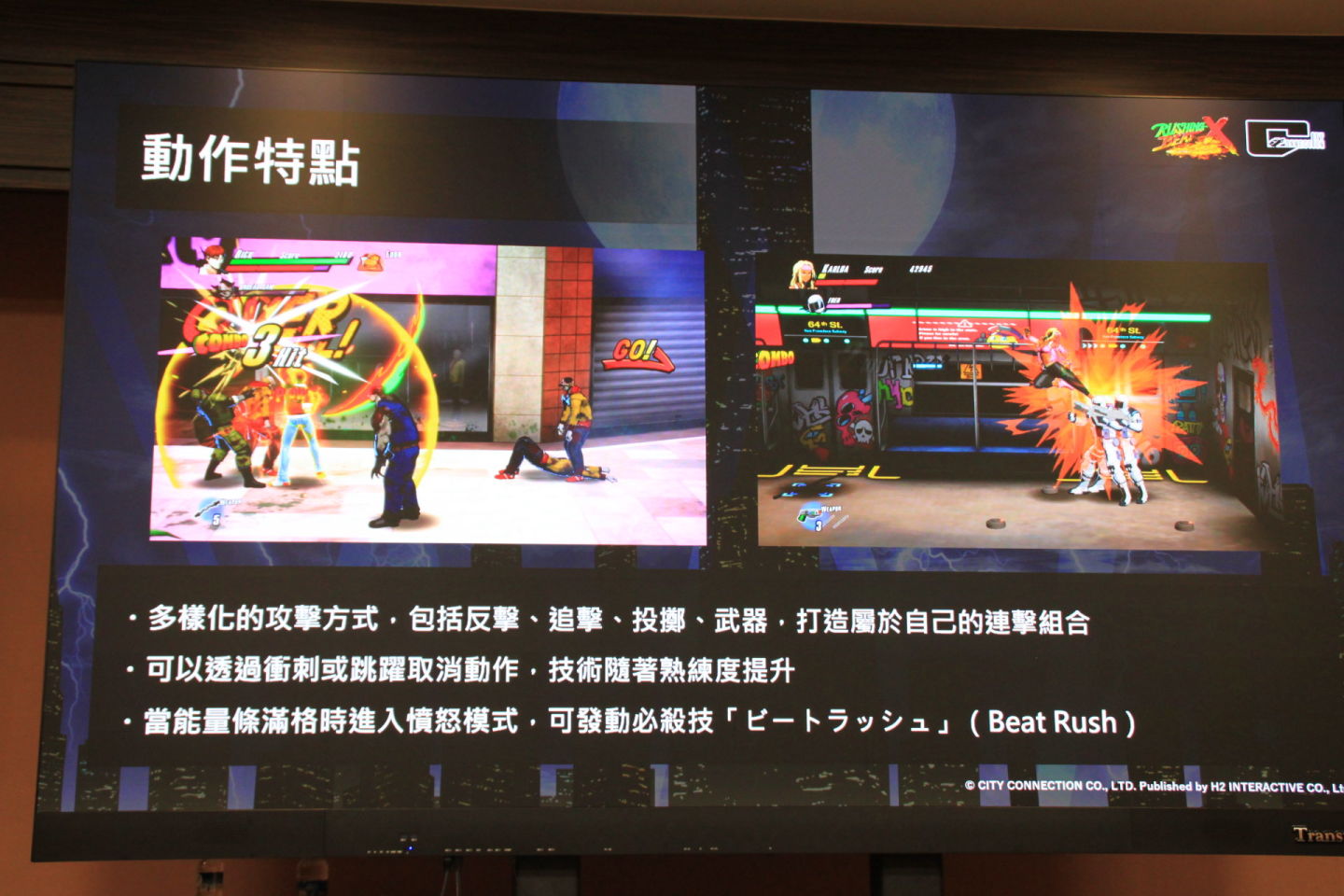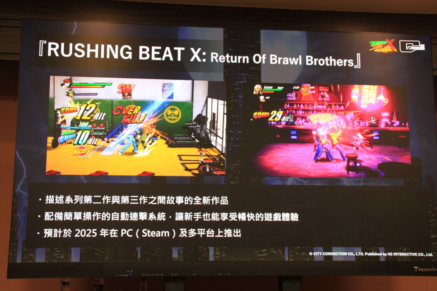 附帶一提,《Rushing Beat X:Return of Brawl Brothers》(快打刑事X)為 City Connection 開發中、日本 Jaleco 於 1992 年起在 SFC 超任主機上推出,支援雙人協力遊玩的 2D 橫向卷軸類型人氣清關動作遊戲《Rushing Beat 快打刑事》系列最新續作。