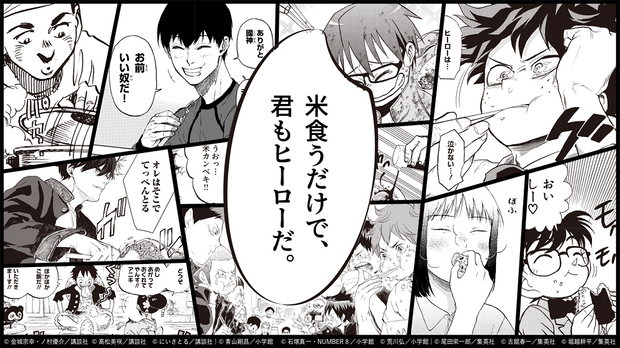 漫畫米袋以漫畫中的英雄(主角)們吃美味米飯的場景為主題,來傳達「只要吃米飯,你就是英雄」的訊息;品牌米與漫畫作品的組合分別為ゆめみづほ與《藍色監獄》、《躍動青春》、《WIND BREAKE—防風少年—》/こしひかり與《名偵探柯南》、《BLUE GIANT MOMENTUM》、《銀之匙》/ひゃくまん穀與《ONE PIECE》、《排球少年!!》、《我的英雄學院》。