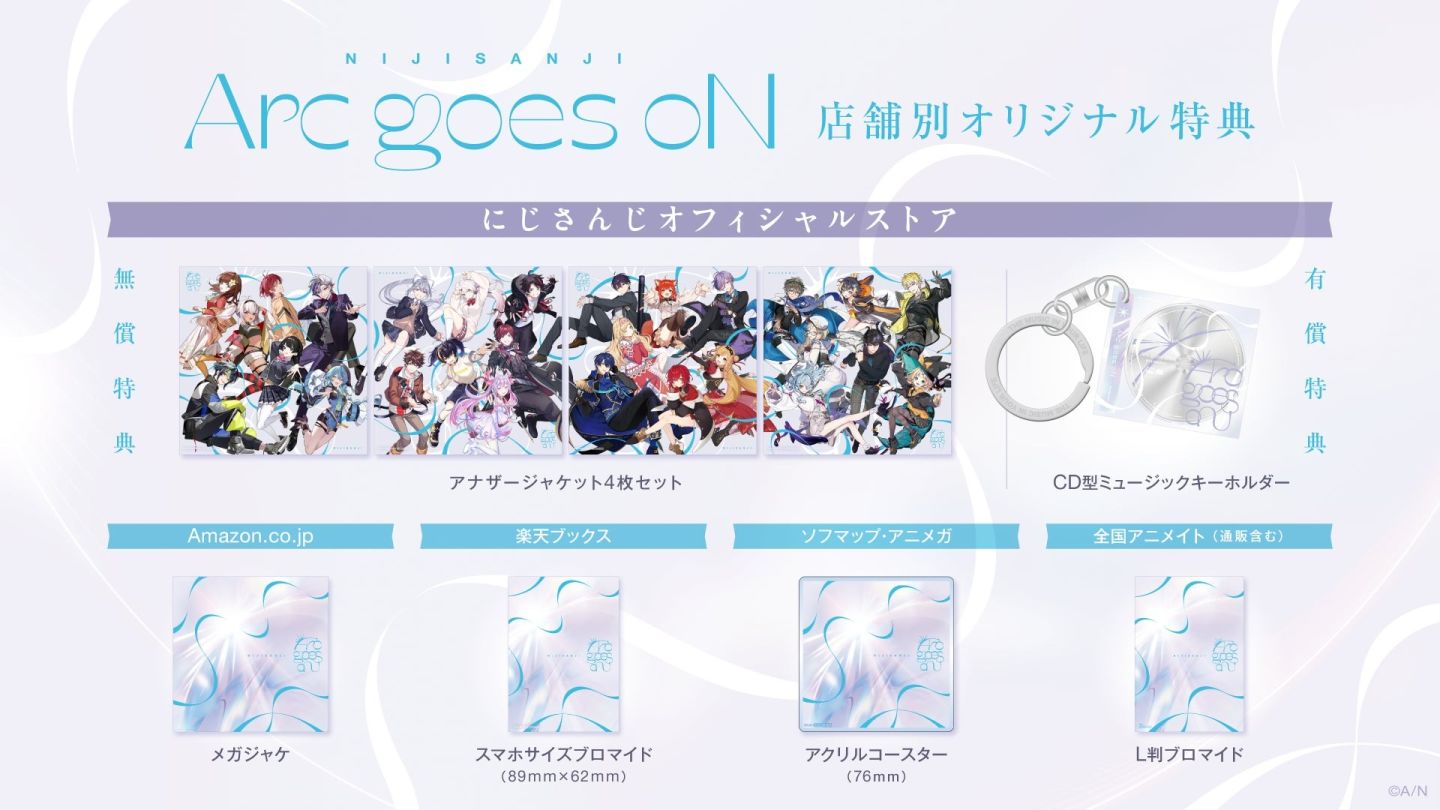 官方也同步公開〈Arc goes oN〉的彩虹社官方商店預購特典,免費特典為特別封面四件套組,付費特典則為 CD 造型鑰匙圈,其他通路的預購特典也已經公開;〈Arc goes oN〉預定 2/26 發行,並將在 2/3 搶先於各音樂平台上架,歌曲 MV 將於日後在彩虹社官方 Youtube 上公開敬請期待!