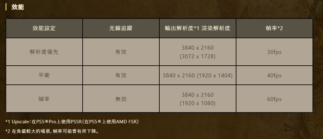 根據官方提供的技術數據,在 PS5 Pro 上,遊戲使用 PSSR 進行 Upscale(解析度提升),而 PS5 則使用 AMD FSR 進行升級。此外,官方表示在負載較大的場景下,幀率可能會有部分下降,玩家可根據需求選擇適合的模式進行遊玩。