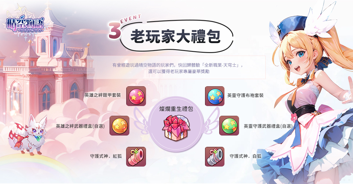 .老玩家大禮包:只要是曾經有遊玩過《晴空物語Online》的玩家,完成預約流程,將於遊戲上市後收到序號領取內含許多豪華獎勵的「燦爛重生禮包」喔!