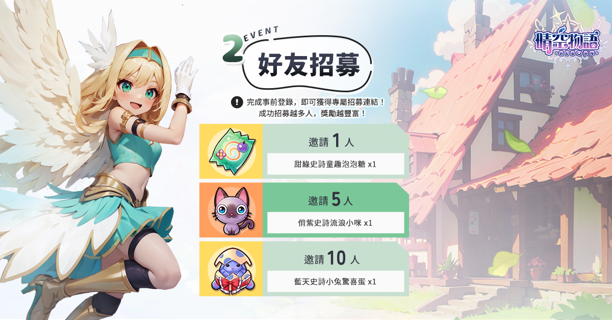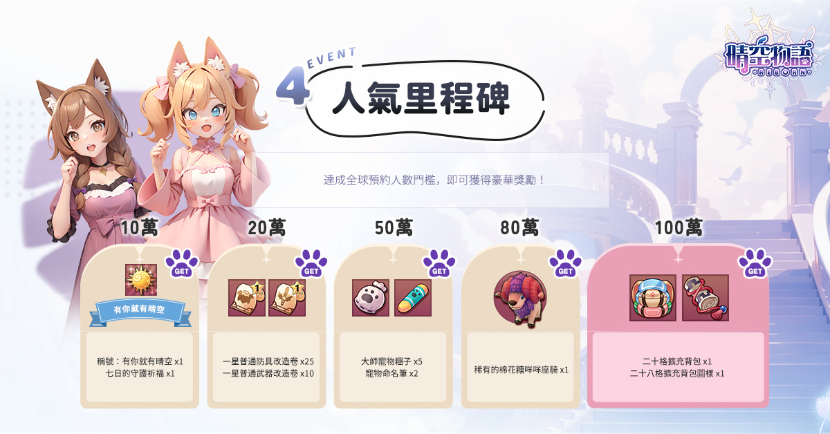 .人氣里程碑:全球玩家一同來為了《晴空物語:REBORN》全球版集氣吧!邀請越多人來預約,好禮獎更多,除了各式實用的裝備道具之外,更有豪華的「稀有的棉花糖咩咩座騎」等著大家來領取喔,快邀請好友一起來加入吧!