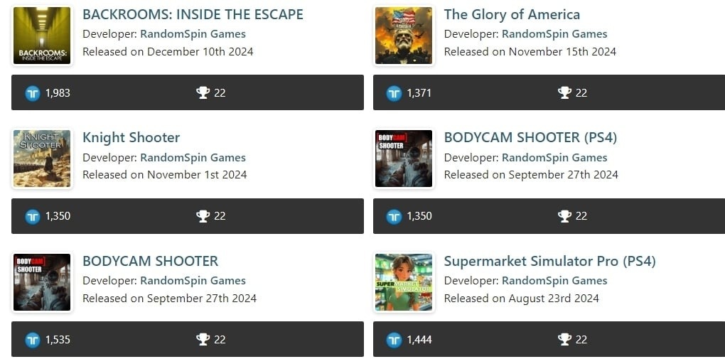 RandomSpin Games 以每月發佈多款遊戲著稱,包含近期推出的《BACKROOMS:INSIDE THE ESCAPE》和《BODYCAM SHOOTER》。這些遊戲分別是基於「後室」(Backrooms)題材的恐怖遊戲與仿「隨身攝影機」(Bodycam)視角的 FPS,但它們皆被認為是使用現成素材快速製作的「資源翻製」遊戲。截至目前為止,這些遊戲的商店頁面均已關閉,RandomSpin Games 的過往作品也幾乎從 PS Store 上消失。