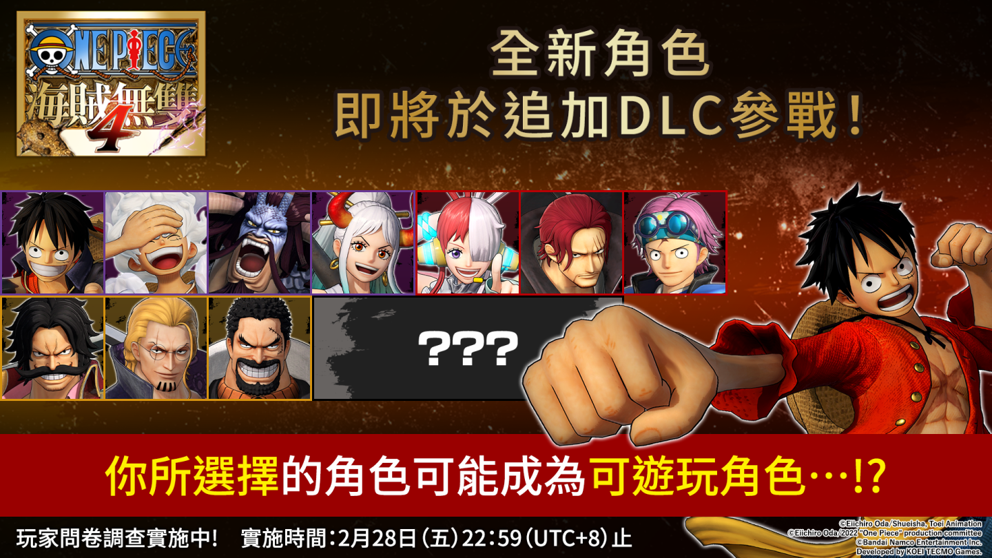 全新可遊玩角色將於追加 DLC 中參戰本作。參戰角色將透過玩家問卷調查的結果決定,玩家將可從 23 名角色中選擇 3 名角色。歡迎各位玩家提供意見(填寫問券需登錄 BNID,可免費申請)。