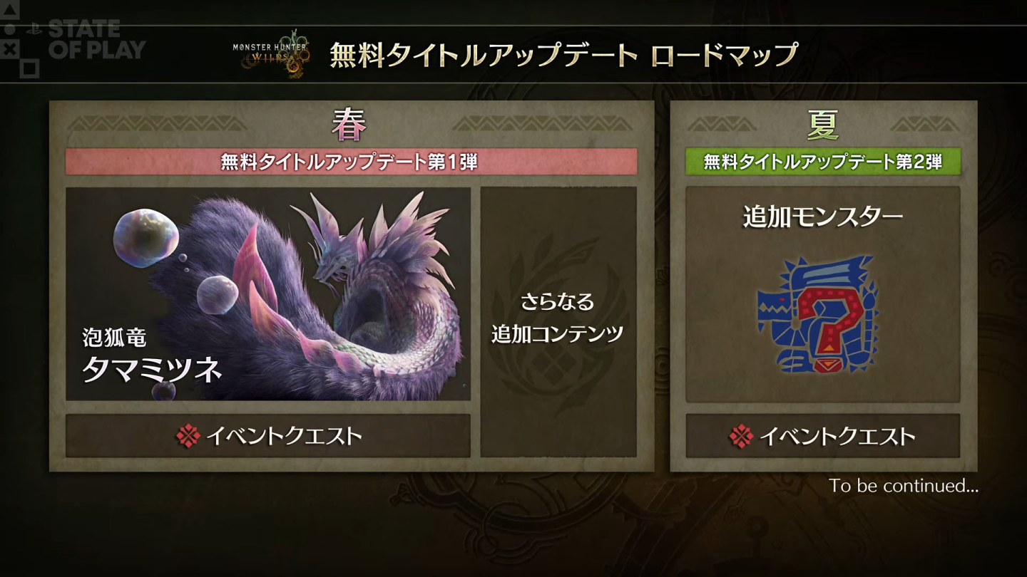 Capcom 在今日(2025 年 2 月 13 日)舉辦的 「State of Play」 發表會上,公布了 《魔物獵人 荒野》(Monster Hunter Wilds) 的最新資訊。本次公開的內容涵蓋 2025 年春季免費更新 的計畫,並確定將加入泡狐龍,同時帶來新活動任務與額外追加內容。