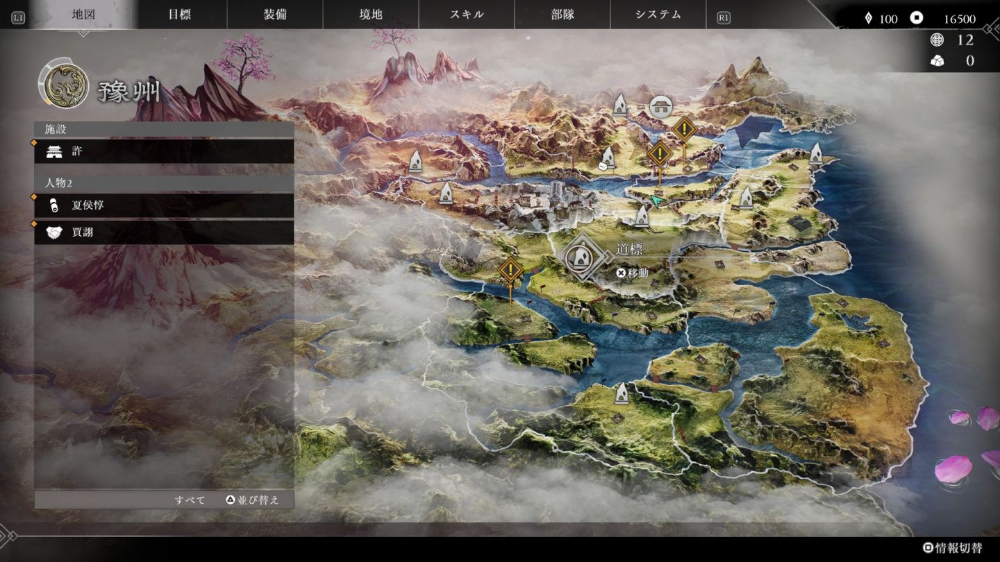 「大陸地圖」上散佈數個城鎮,進入城鎮可以購買武器,城鎮中也有可作為據點的旅店,可以在裡面製作特別的裝飾品「寶玉」,或者閱讀武將們寄來的信。