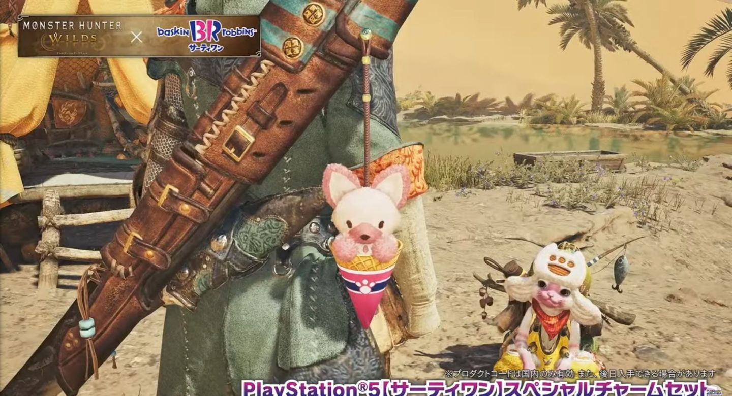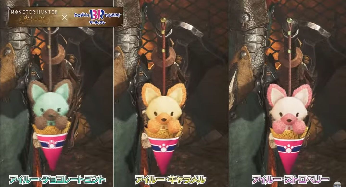 為慶祝最新作品《魔物獵人 荒野》即將在 2/28 狩獵解禁,與31冰淇淋推出了合作商品,將附有造型壓克力鑰匙圈與原創湯匙,以及可獲得 PS5 版「31 特別裝飾品」的產品代碼,輸入後可獲得特別飾物(共三款),可用在獵人武器或騎乘生物鷺鷹龍上,所有口味都以艾路的外型為基礎設計成可愛的造型。