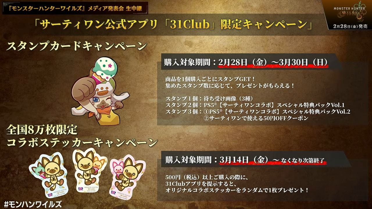 《魔物獵人 荒野》冰淇淋套裝可於31冰淇淋官方網站或使用官方應用程式《31Club》訂購,產品數量有限售完為止,此外該代碼只在日本有效,日後可能有其他入手的方法;自 2/28 到 3/30 為止,在 App《31Club》上還會舉辦特別活動,用戶每購買一件產品就能收集印章,可獲得特別待機圖像,以及 PS5 專用的「31聯名特典包 Vol.1/Vol.2」,原創合作貼紙也將於 3/14 起開始分發,各位獵人們不要錯過!