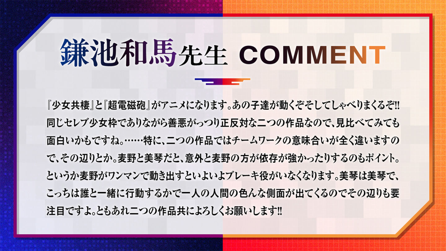 對於《某暗部的同居少女》動畫化,原作者鎌池和馬在感言中表示這部作品與《科學超電磁砲》雖然都是以人氣女角為主題的作品,但是兩者之間的善與惡卻截然相反,所以比較一下可能會很有趣,特別是作品中對於「團隊合作」的意義完全不同,希望觀眾能夠喜歡這兩部作品。