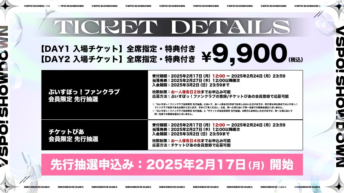 Brave Group 宣布,旗下次世代電競 VTuber 團體「VSPO!」(ぶいすぽっ!),將於 3 月 22、23 兩日於兩國國技館舉辦「VSPO! SHOWDOWN powered by RAGE」活動,自即日起開始接受 VSPO! 粉絲俱樂部先行抽選與「Ticker Pia」先行抽選申請。