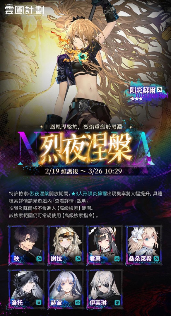 特許檢索.烈夜涅槃開放期間,★3 人形隕炎蘇爾出現機率將大幅提升。