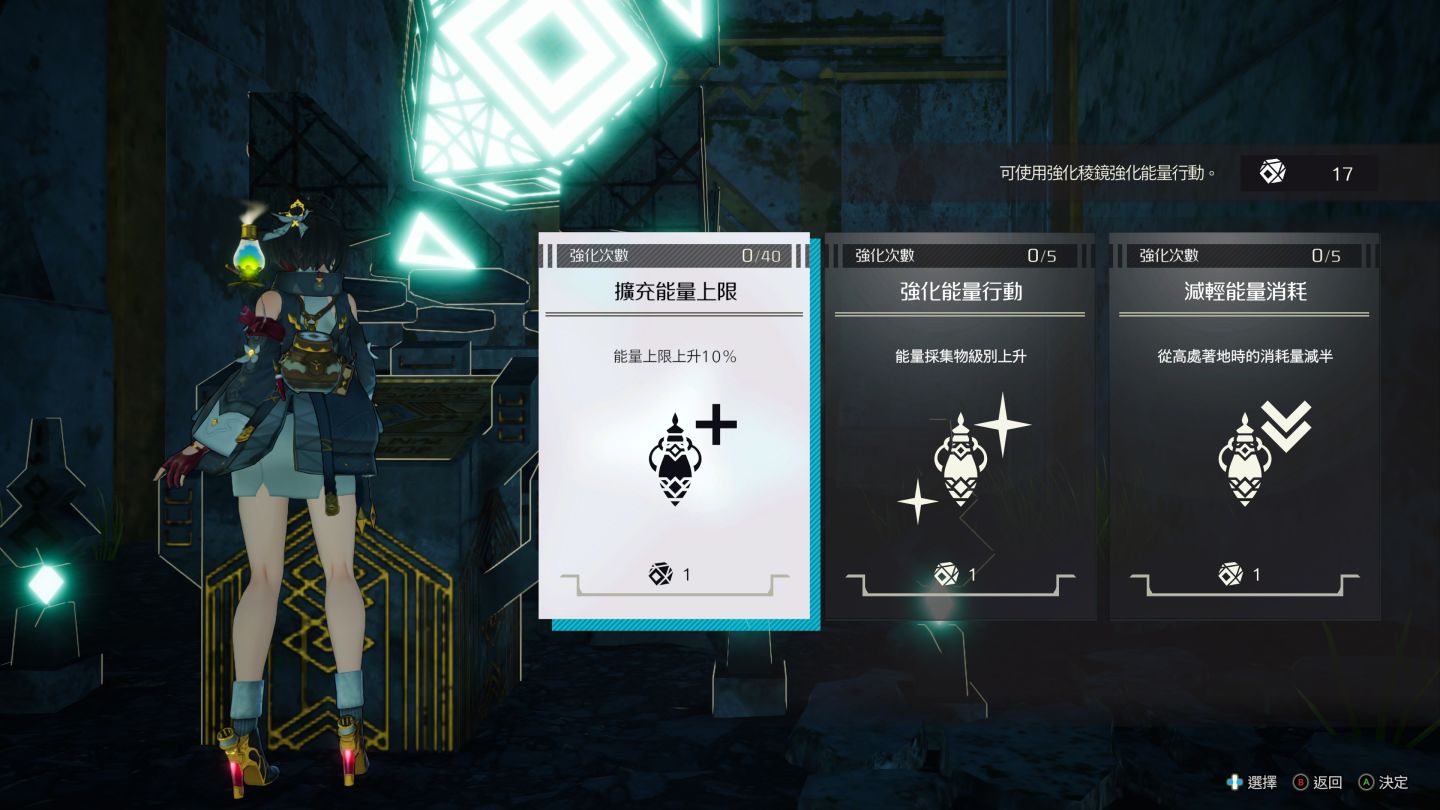 能量系統是這次新增的限制機制,每次高低差探索消耗一定的能量,也是角色摔不死的代價之一,能量關係到戰鬥失敗時是否能夠原地返回,能量槽同時影響簡易調合成敗率與戰鬥時的瑪那恢復速度,可以透過特定設施回復能量,但就算找不到設施,快速旅行回據點也是不會打斷太多節奏的方式,