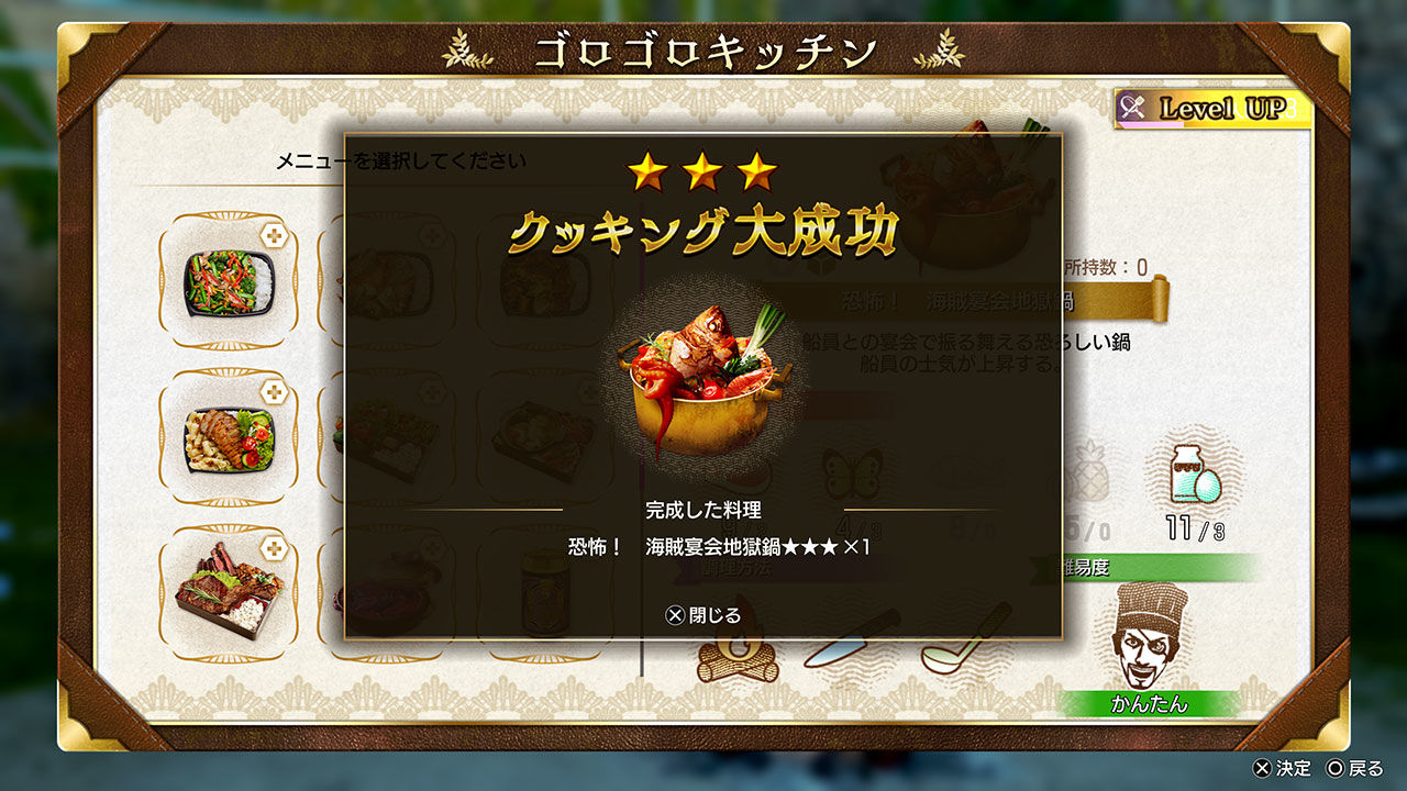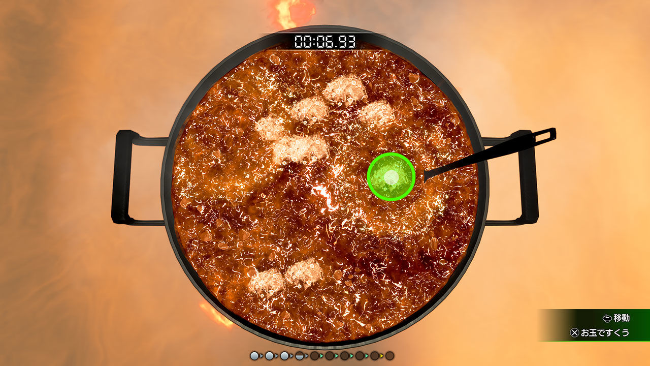 真島擔任主廚!?製作出頂級料理的吾朗廚房!用探索街道和大海時獲得的食材製作料理吧!根據想製作的料理,透過「生火」、「大秀刀工」和「撈浮渣」等各種不同的烹飪手法,完成的料理會有回復體力或回復熱血量表等效果!