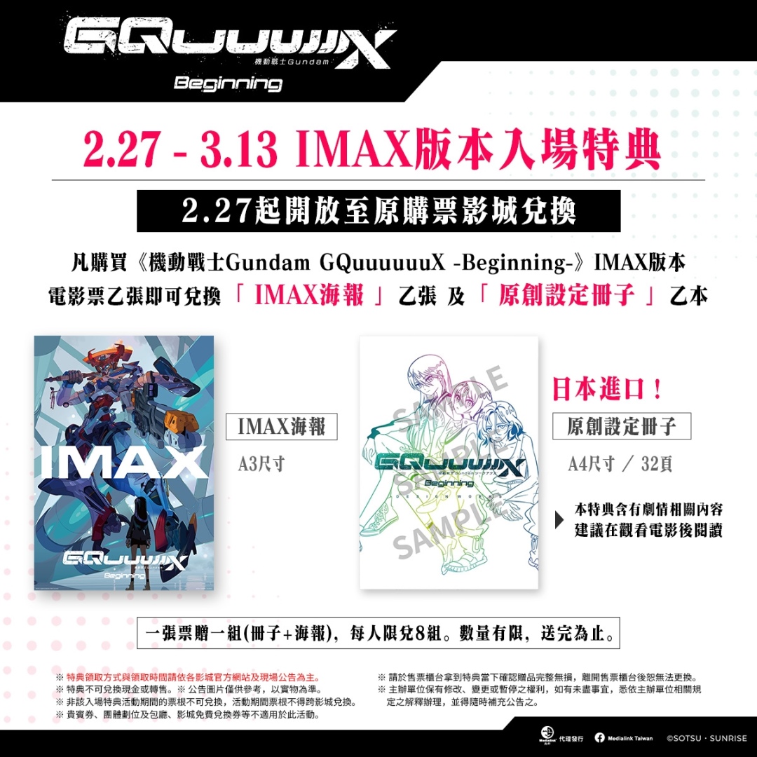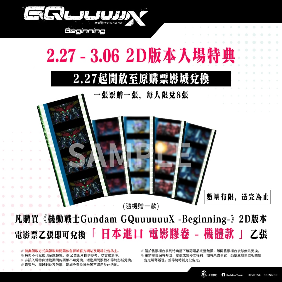 為回饋粉絲熱情支持,電影公司將推出購票送限定特典的活動:凡購買 IMAX 版本電影票乙張,即可兌換「IMAX」海報乙張及「原創設定冊子」乙本。每一張票贈送一組,一人限兌 8 組;而購買一般 2D 版本電影票乙張的觀眾,可隨票獲得「電影膠捲 機體款」一張,隨機贈送一款,每人限兌 8 張。數量都極為有限,送完為止,喜歡的觀眾趕緊手刀購買。