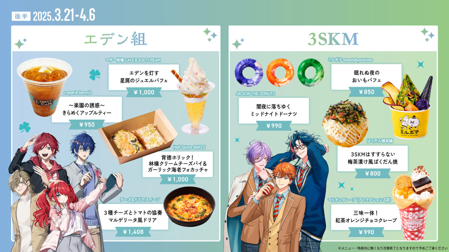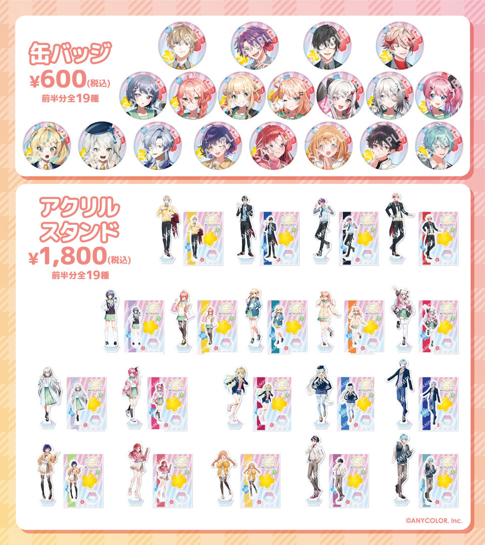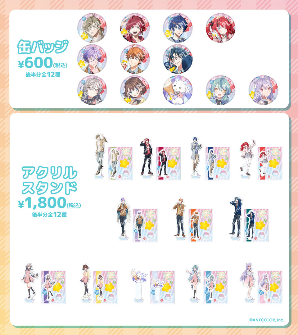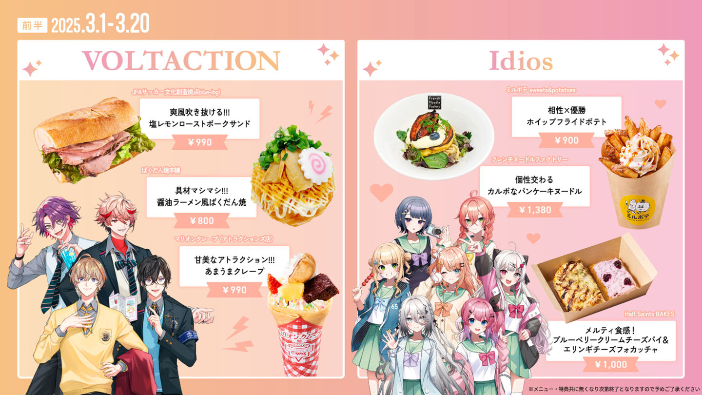 場區內也會販售聯名餐點(凡消費聯名餐點可獲得免費透明杯墊)和原創周邊(壓克力立牌&徽章),販售內容也會隨著活動時期產生變化,讓粉絲能享受只有在東京巨蛋城才能體驗到的彩虹社特別合作內容,喜歡上述組合與 VTuber 的粉絲們不要錯過!