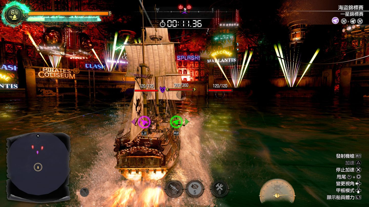 「海盜船戰」系統,分為砲擊階段與接舷戰兩部分。砲擊戰需操控「吾朗丸」的船首機槍與側舷加農砲,加速衝刺閃避彈幕、甩尾等船體操作,船員的屬性可以增加具設施的使用性,這部份來說算是中規中矩的表現。
