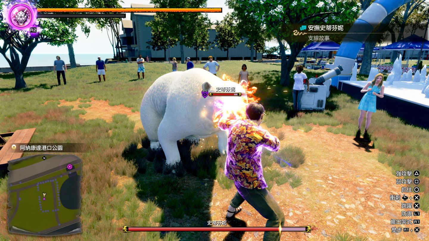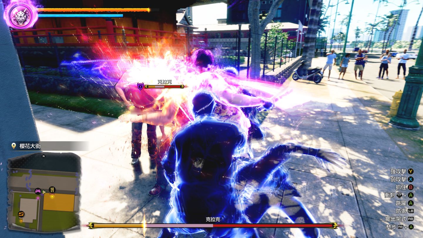 作為真島吾朗標誌性戰鬥風格,「狂犬模式」在本次外傳中獲得全面強化。基礎動作仍以匕首連擊與體術為主,但新增「空中連段追擊」機制,玩家可將敵人擊飛後接續跳躍斬擊,配合「狂氣爆發」可召喚四名分身協同作戰,形成圍毆場面。但可惜空中連段的變化並不多,期待有更多發展,且跳躍、閃避、跑步都在同一個按鍵上,其實有點難操作