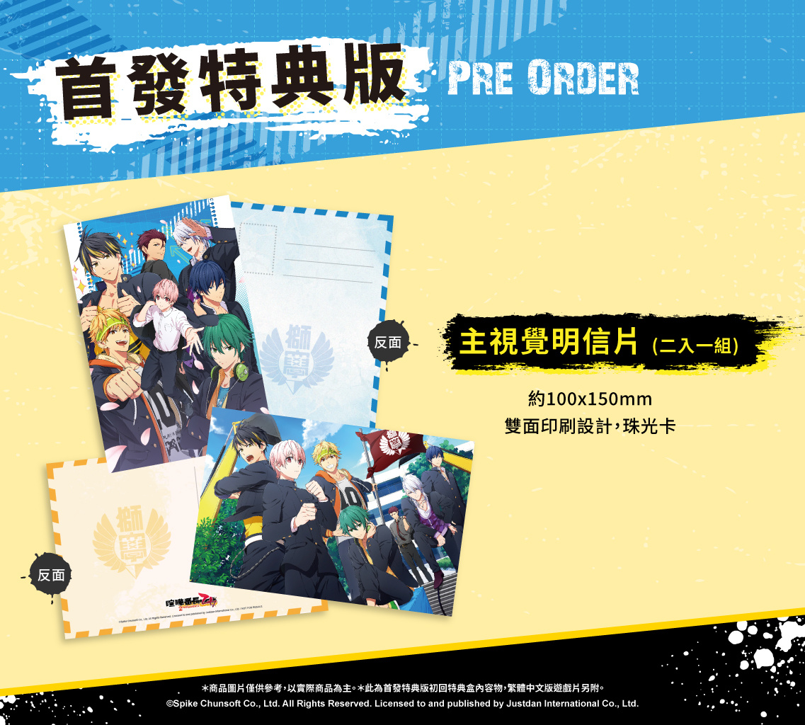 本次《喧嘩番長 乙女 2nd Rumble !!》首批實體版本,均將免費升級為「首發特典版」。內容除了角色透卡(七入一組)、主視覺明信片(兩入一組)之外,還包含中文版獨家的全彩特典小冊子,內容收錄主視覺插畫、角色設定以及精美 CG 圖並完整中文化。