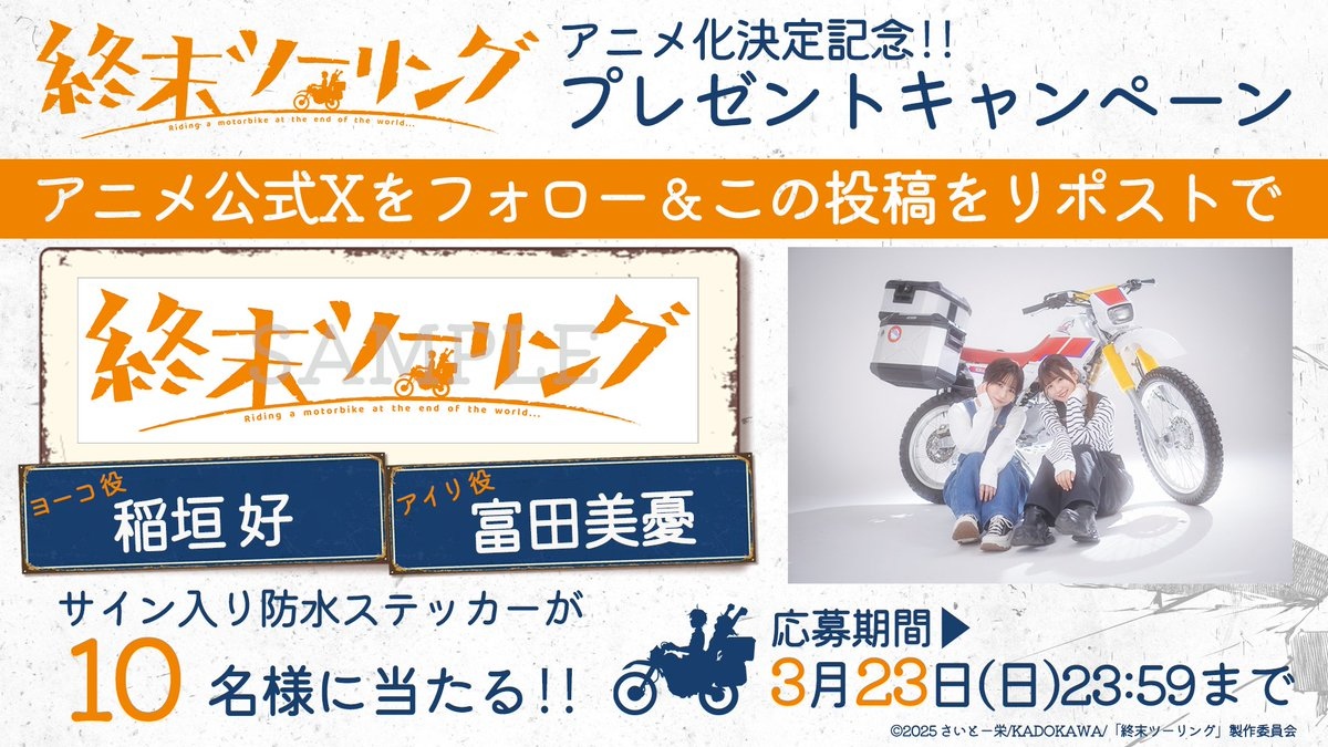 在宣布本作動畫化之前,Aniplex 先前發布了一張標題保密的預告圖,直到今日才正式解禁,與此同時也宣布將由稲垣好和富田美憂分別飾演陽子與艾莉,動畫製作將由 Nexus 操刀,在 PV 中能夠看到少女們騎著越野摩托車走訪已經毀滅世界中的模樣。