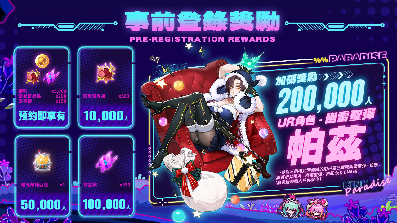 《異種啪樂町》事前登錄成功突破二十萬人里程碑,立即加入即可獲得限定角色等豐富豪禮!包含提升伙伴的必備資源「精幣」、開啟臉紅心跳秘密劇情的專屬資源「奇異奇異果」、獲取伙伴升級 DNA 專用的「輔導級諾亞艙」、在啪樂町中不可或缺的稀有資源「寄星鑽」,以及突破二十萬預約特別加碼獎勵~限定伙伴「幽雷聖彈 - 帕茲」